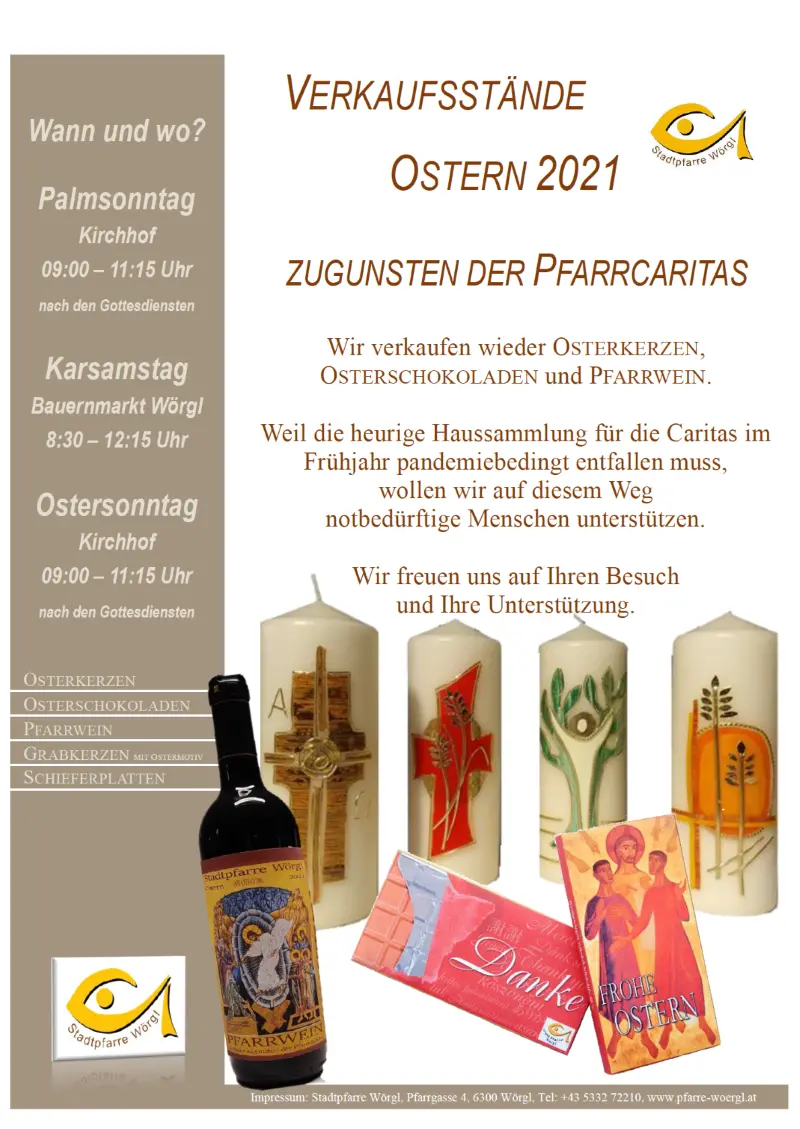 Die Stadtpfarre Wörgl hat auch heuer wieder zu Ostern mit Verkaufsständen beim Wörgler Bauermarkt und im Kirchhof nach den Gottesdiensten ihre Produkte feilgeboten. 84 verzierte Osterkerzen, 170 Grablichter und Pfarrkerzen, 300 Osterschokoladen sowie 60 Flaschen des beliebten Pfarrweins fanden ihre Abnehmer. Es wurde ein Erlös von € 2.200, -- zugunsten der Pfarrcaritas erwirtschaftet.
