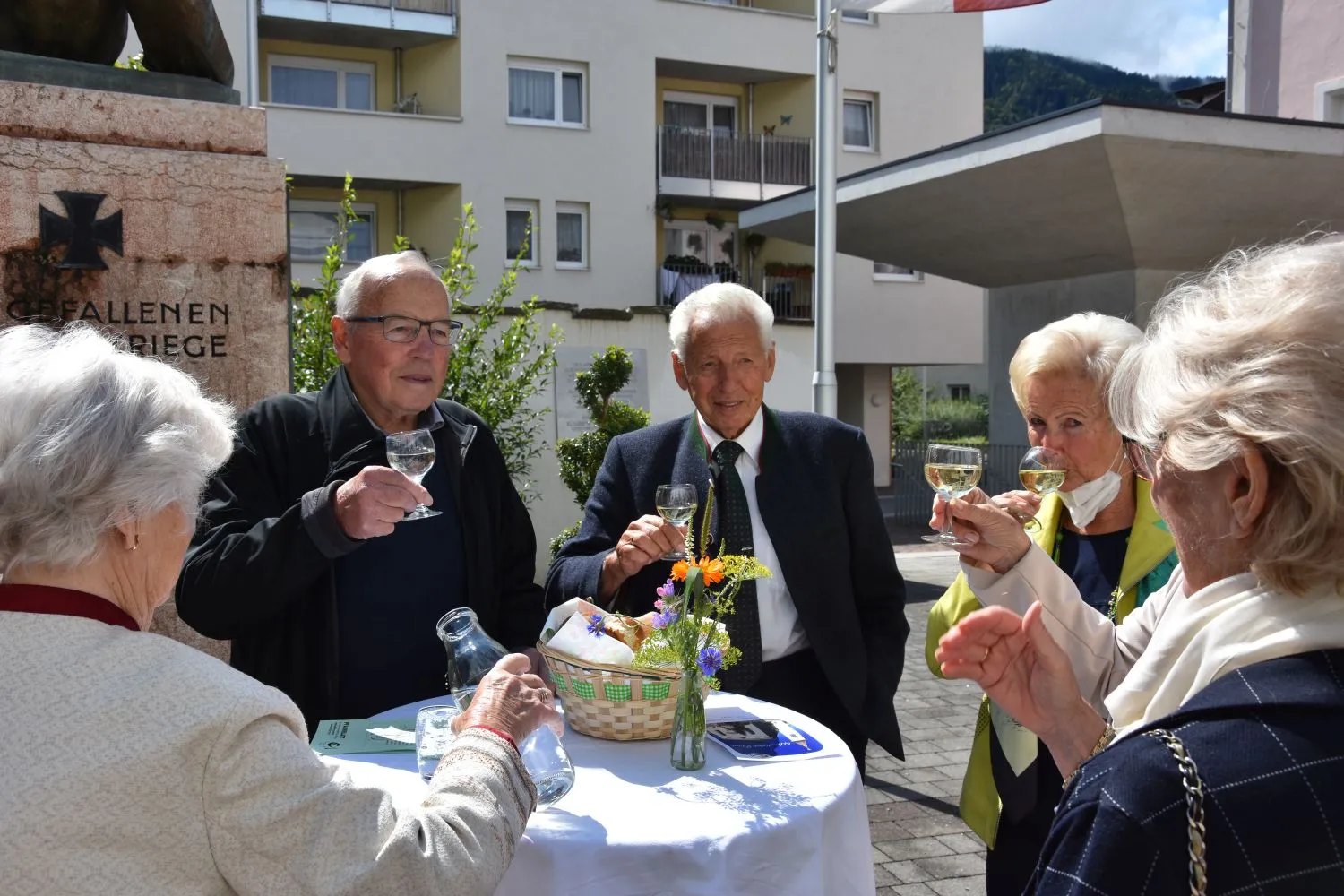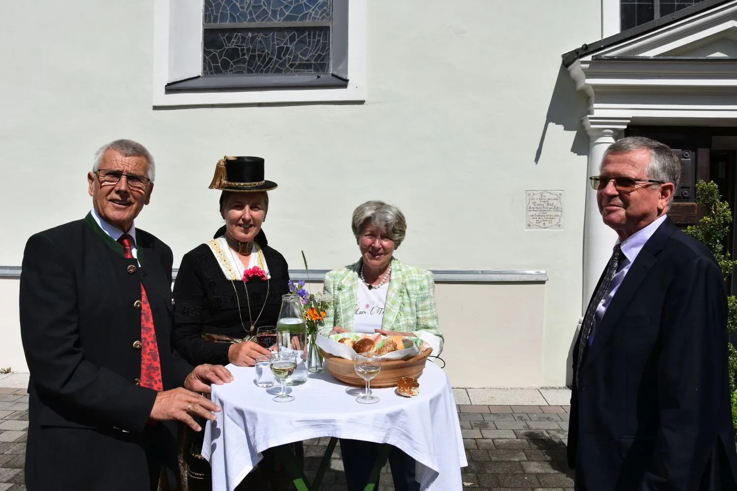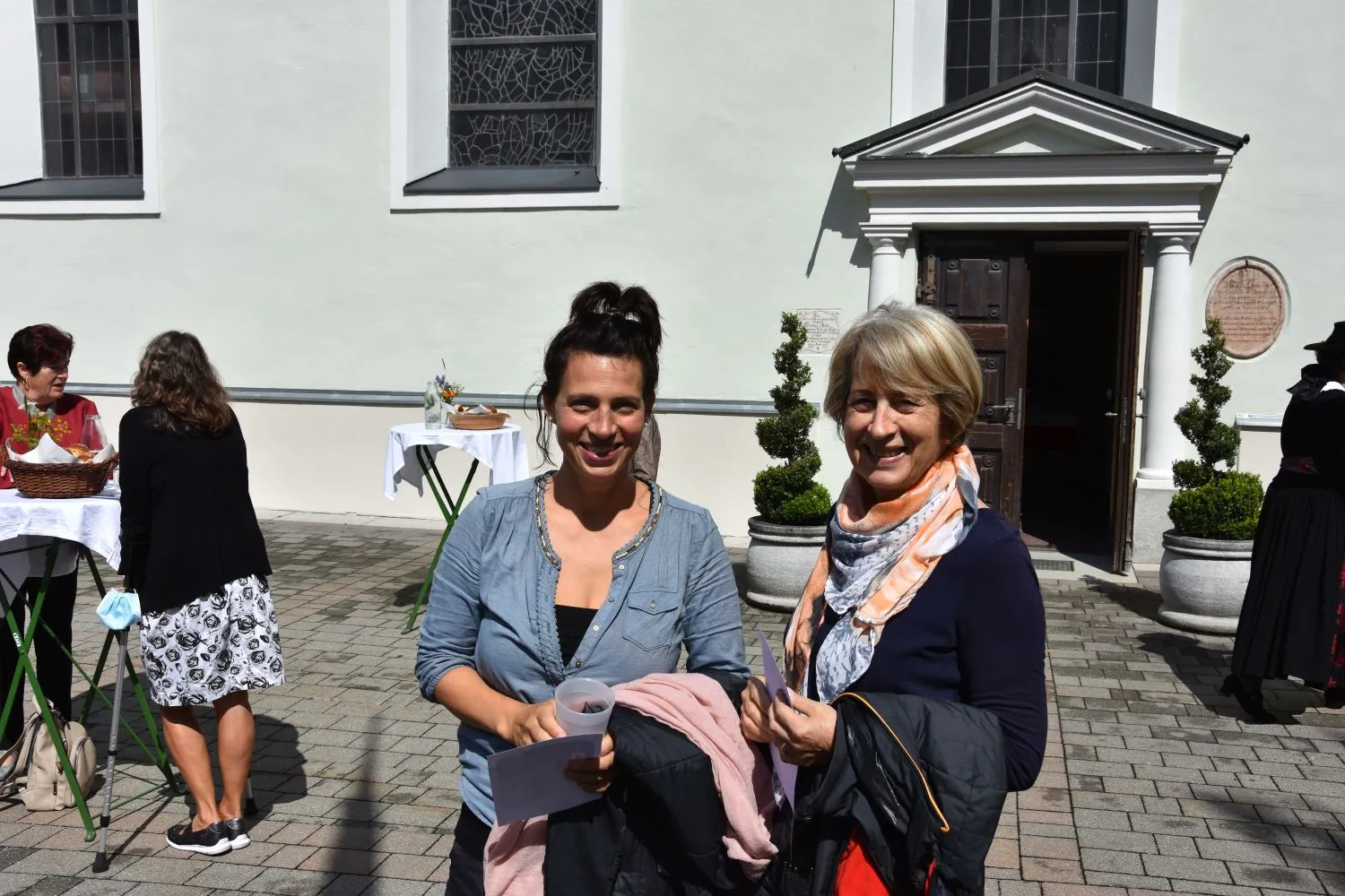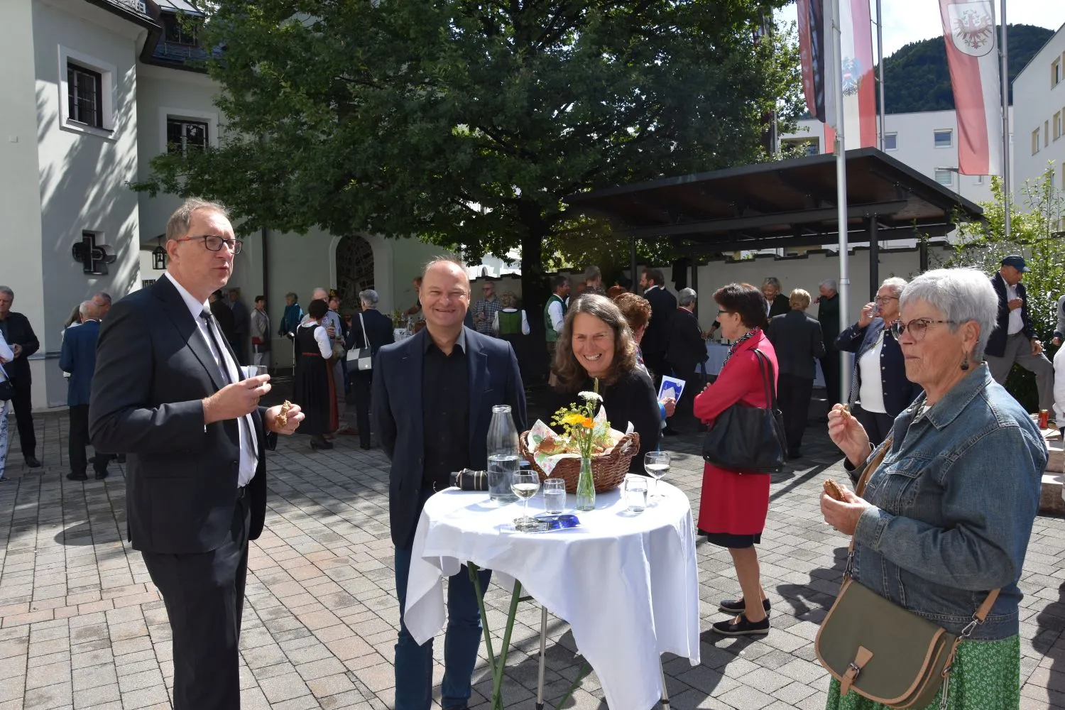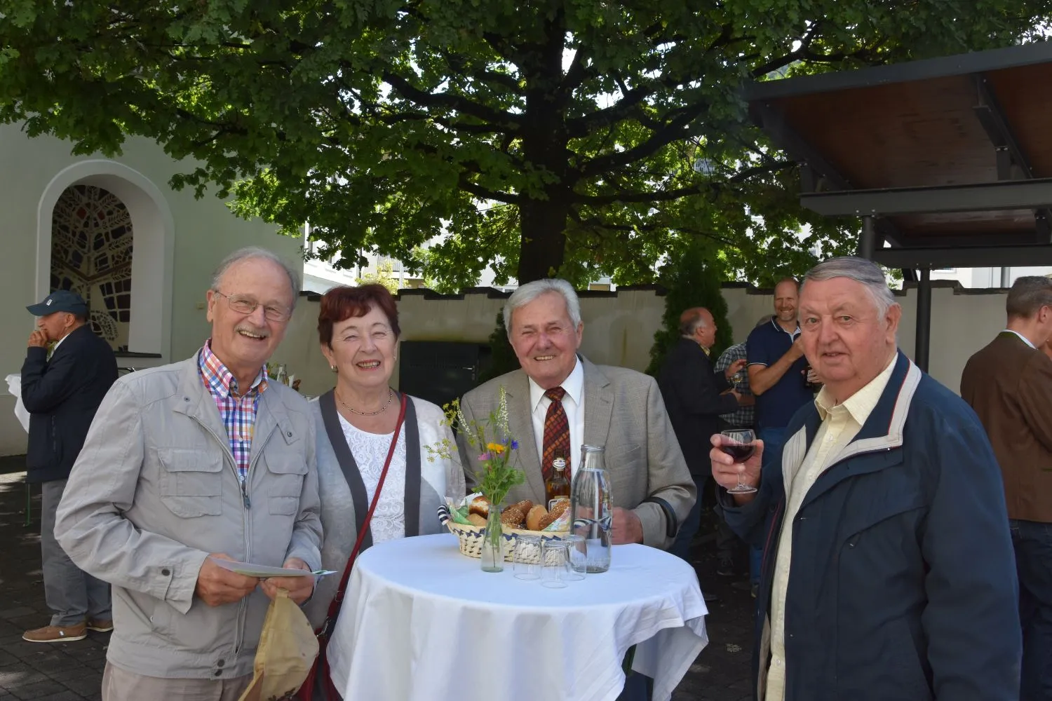 Im Anschluss gab es dann noch eine Agape im Kirchhof, der von fleißigen MitarbeiterInnen der Pfarre zu einem wunderschönen Ort des Feierns hergerichtet wurde. Den Blumenschmuck dafür bereitete Leni Scharnagl gekonnt und mit viel Liebe vor. Man merkte, dass den Menschen nach der langen Absenz sozialer Zusammenkünfte das gemeinsame Plaudern bei einem Gläschen Wein und mit einem Jourgebäck der Fa. Mitterer Spaß machte.