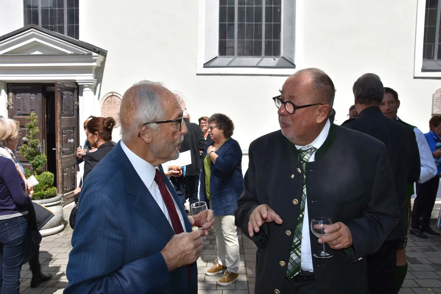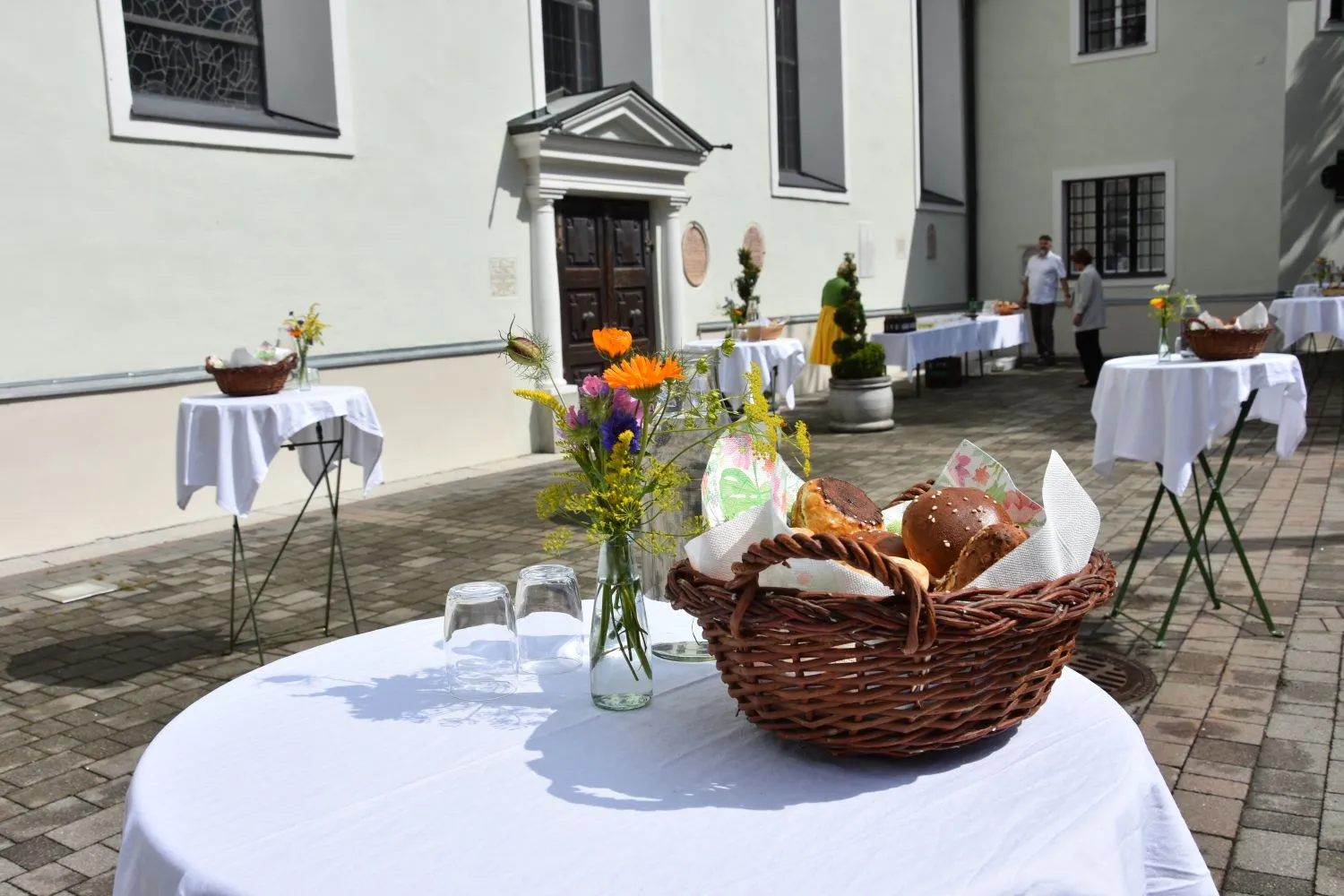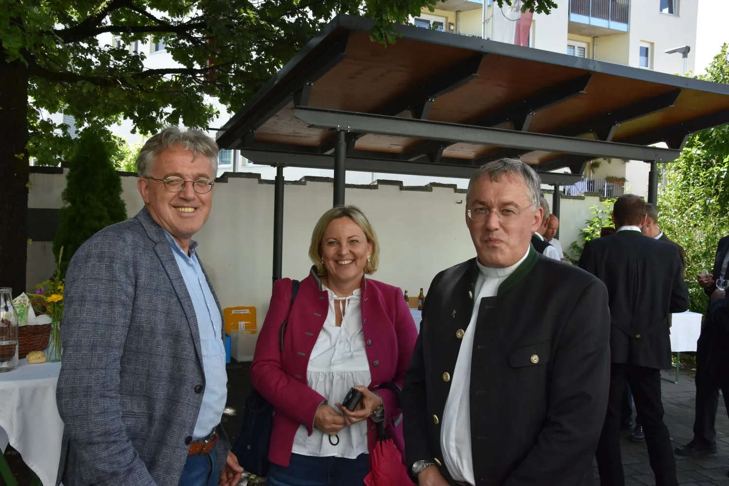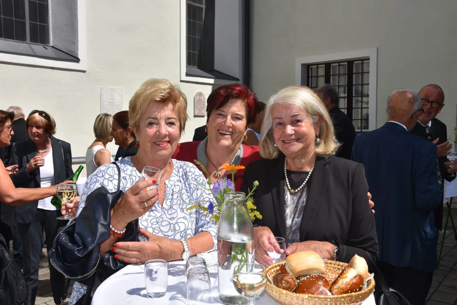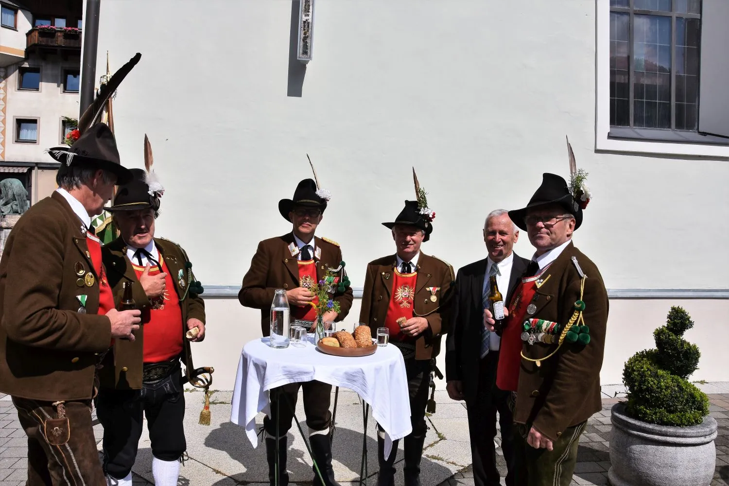 Im Anschluss gab es dann noch eine Agape im Kirchhof, der von fleißigen MitarbeiterInnen der Pfarre zu einem wunderschönen Ort des Feierns hergerichtet wurde. Den Blumenschmuck dafür bereitete Leni Scharnagl gekonnt und mit viel Liebe vor. Man merkte, dass den Menschen nach der langen Absenz sozialer Zusammenkünfte das gemeinsame Plaudern bei einem Gläschen Wein und mit einem Jourgebäck der Fa. Mitterer Spaß machte.