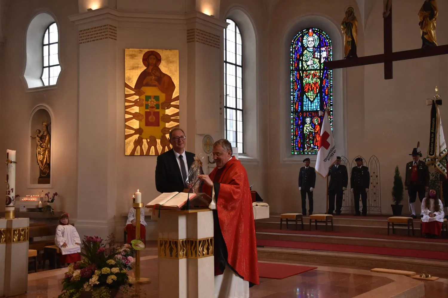 Den wesentlichen Protagonisten der Kirchenrenovierung, Johann Mauracher, Obmann des Pfarrkirchenrates, Pfarrkirchenrat Architekt Hubert Lechner, der ehrenamtlich die Planung, Organisation und Koordination der Arbeiten innehatte, Pfarrkirchenrat Hanspeter Gruber, der die Abwicklung des Spendenkontos über das Bundesdenkmalamt verantwortete und Pfarrsekretärin Ingrid Spitzenstätter, die die Verwaltung, Antragstellung für Fördergelder und Sitzungskoordination überhatte, wurde mit kleinen Anerkennungsgeschenken herzlichst für die intensive und professionelle Arbeit gedankt.