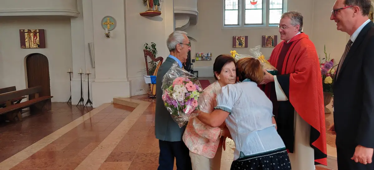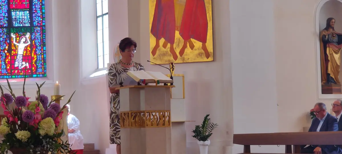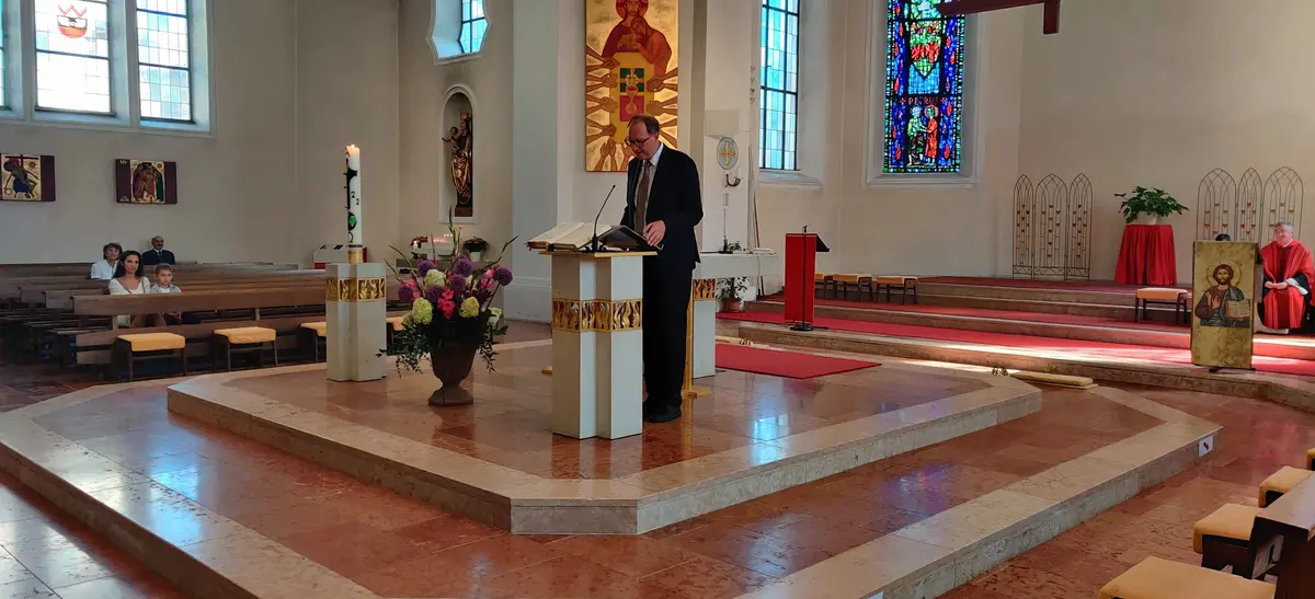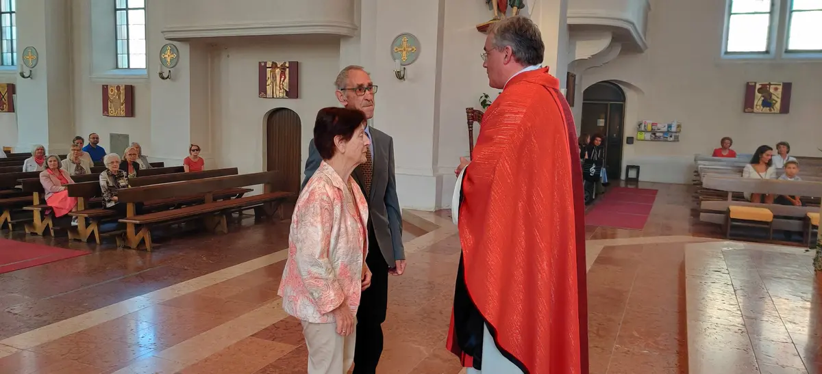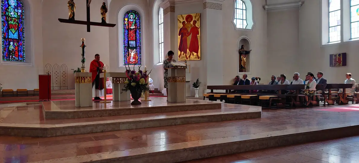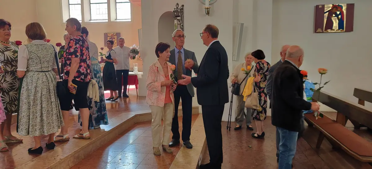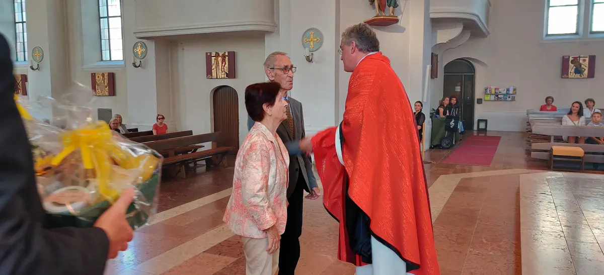 Pfarrer Christian ging in seiner Predigt auf die Aspekte des Tagesevangelium ein ("Das Weizenkorn muss sterben, um neue Frucht hervorzubringen"), lenkte den Blick auf das Wirken des Heiligen und Märtyrers Laurentius, der auch im rechten Fenster der Apsis dargestellt ist, um dann auf den speziellen Aspekt der Dankesfeier überzuleiten, der Bedankung des Stadtpfarrchores, seines Obmanns Hans Filzer und seiner Gattin Brigitte Filzer für das jahrzehntelange, segensreiche künstlerische Wirken.