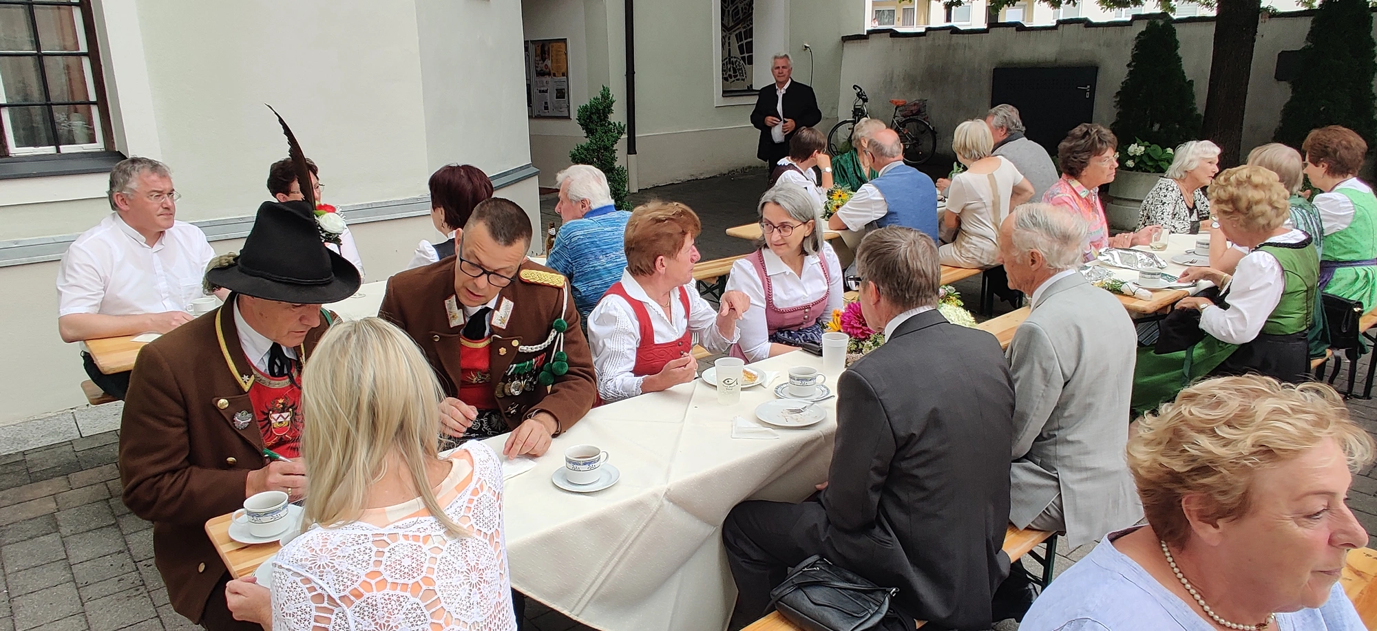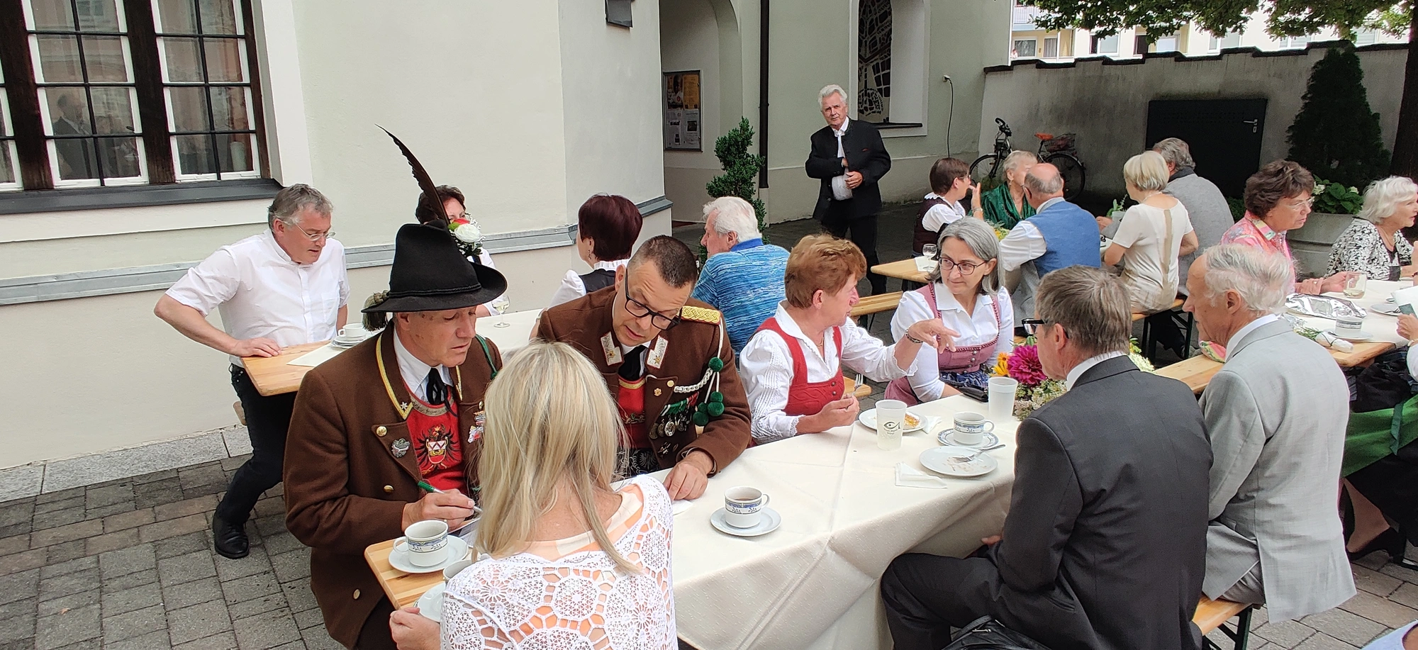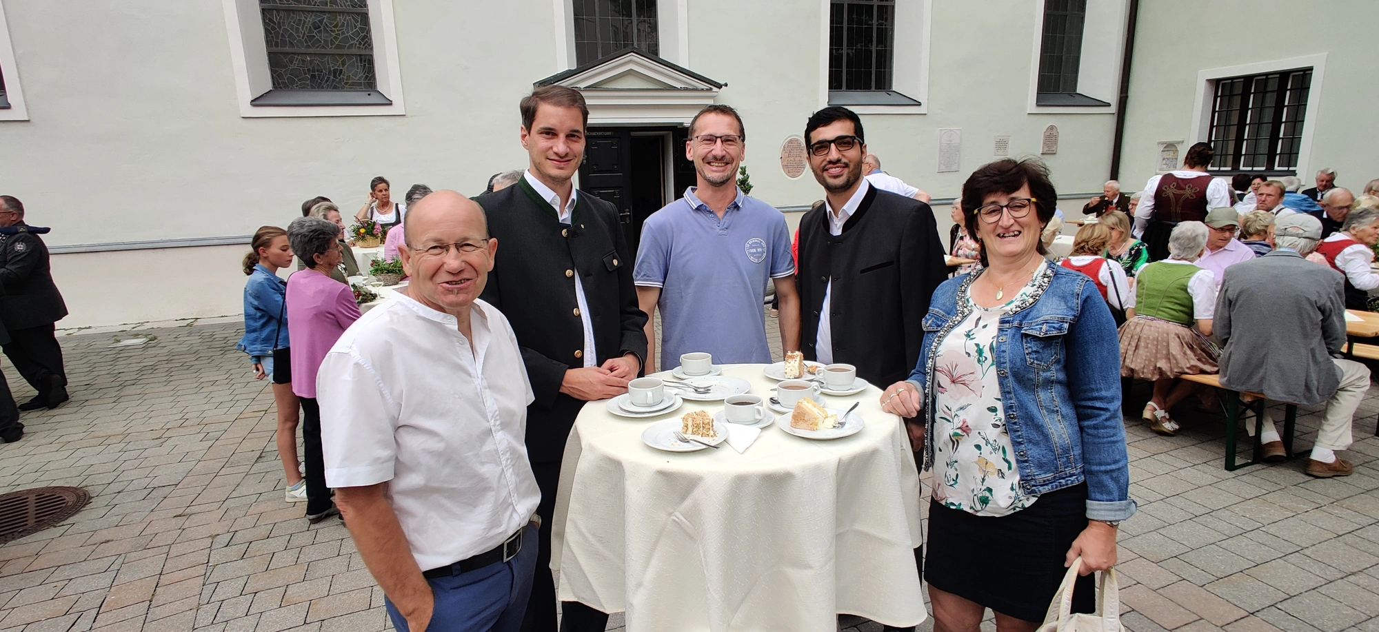 Nach dem Festgottesdienst, bei dem traditionellerweise auch eine Kräuterweihe stattfindet, die sich nach wie vor großer Beliebtheit erfreut, konnte aus einer Vielzahl an herrlichen Kuchen und Torten ausgewählt und fürstlich geschlemmert werden. Der "Hoagoscht" bzw. "Kaffeeklatsch" durfte dabei natürlich nicht zu kurz kommen. Bei angenehmen Wetter entpuppte sich der Kirchhof wieder einmal als idealer Treffpunkt. Mit Biertischen, Bänken (Leihgabe der FF Wörgl) und Stehtischen zauberte das Organisationsteam um Charlie Schallhart wieder ein herrliches Festambiente, an dem es sich nicht nur wegen der angenehmen Temperaturen trefflich feiern ließ. Auch der neu gewählte Bürgermeister, Michael Riedhart, Vizebürgermeister Kaya Kayahan und weitere Vertreter*innen der Gemeindepolitik ließen sich das Pfarrevent nicht entgehen.