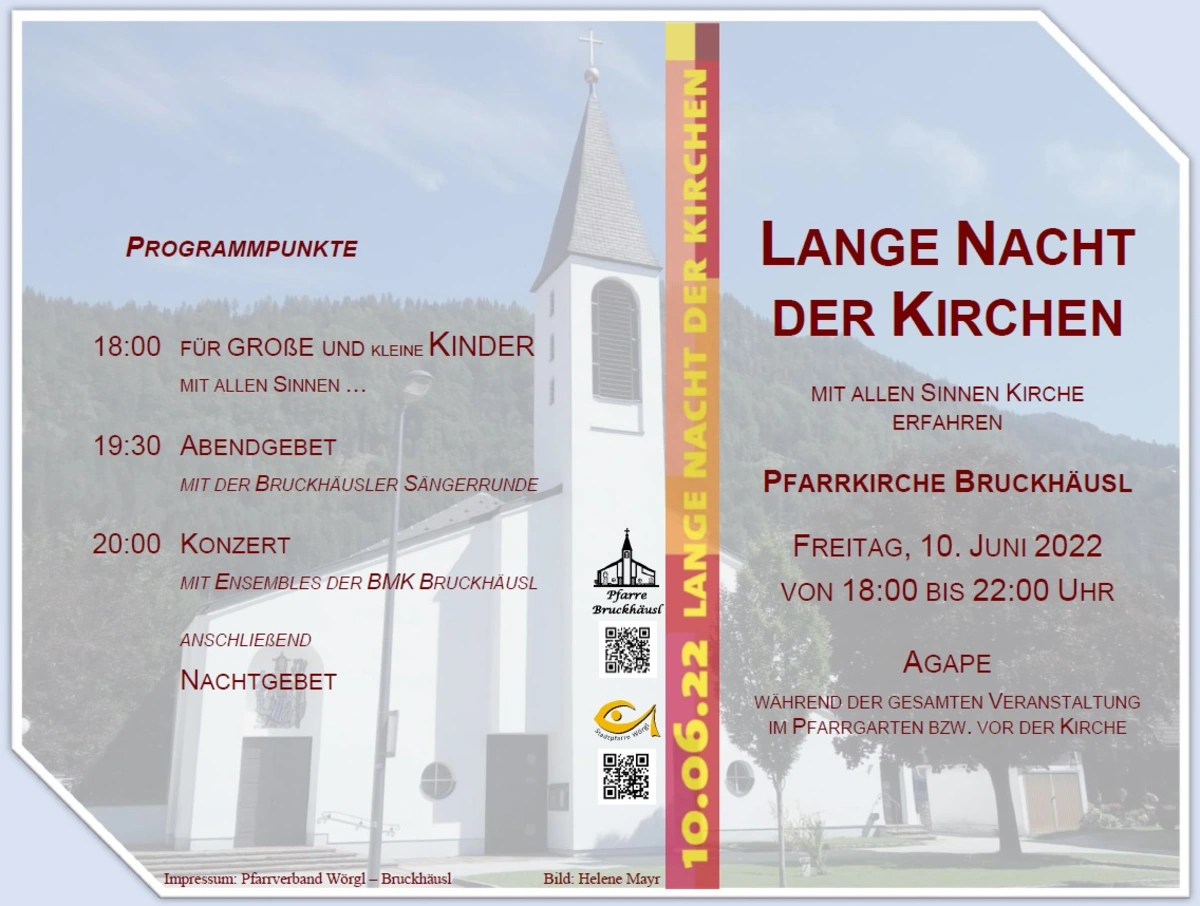 Alle zwei Jahre findet in der Pfarrkirche Bruckhäusl, initiiert und begleitet von Pfarrprovisor Christian Hauser, im Rahmen des Pfarrverbandes Wörgl - Bruckhäusl, die „Lange Nacht der Kirchen“ statt. In der Begrüßung geht PA Christian Ehrensberger kurz auf diese gemeinsame, mystische Nacht ein.