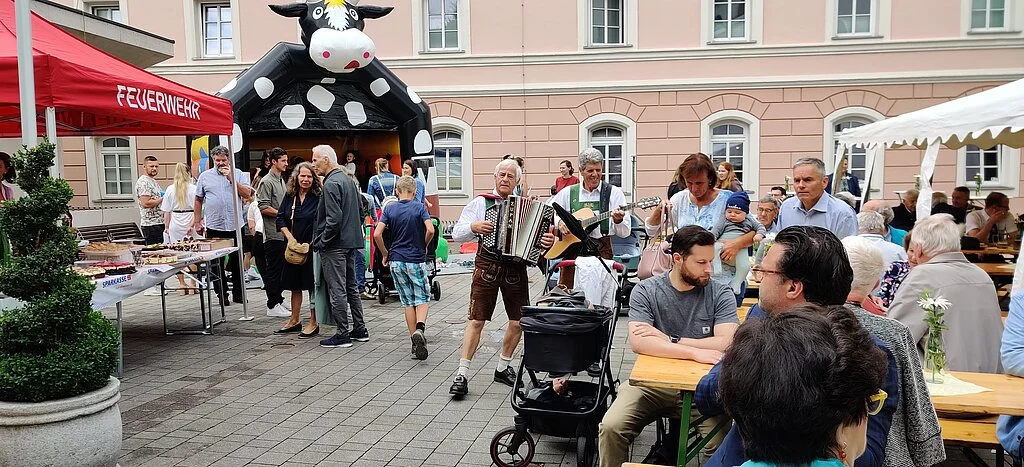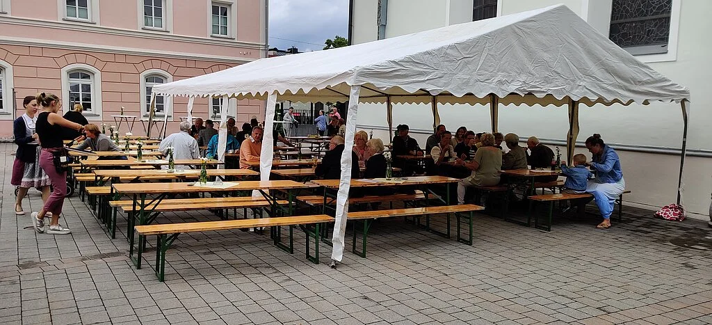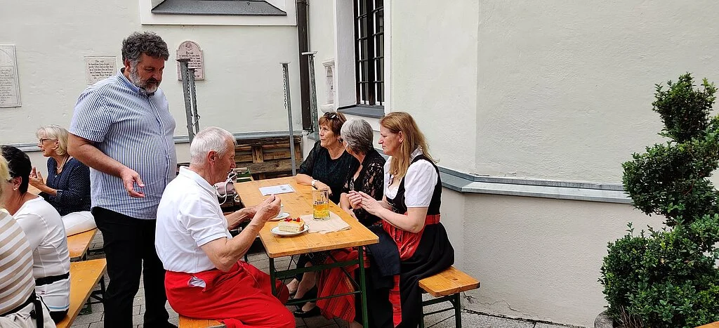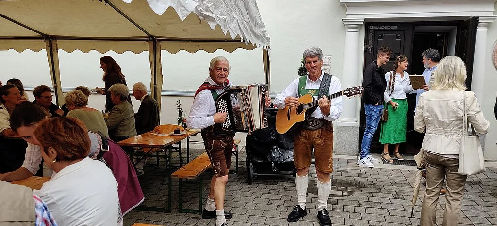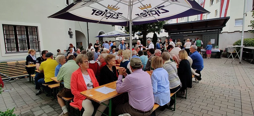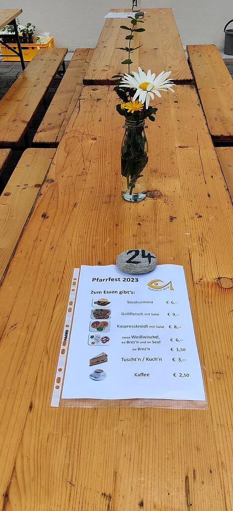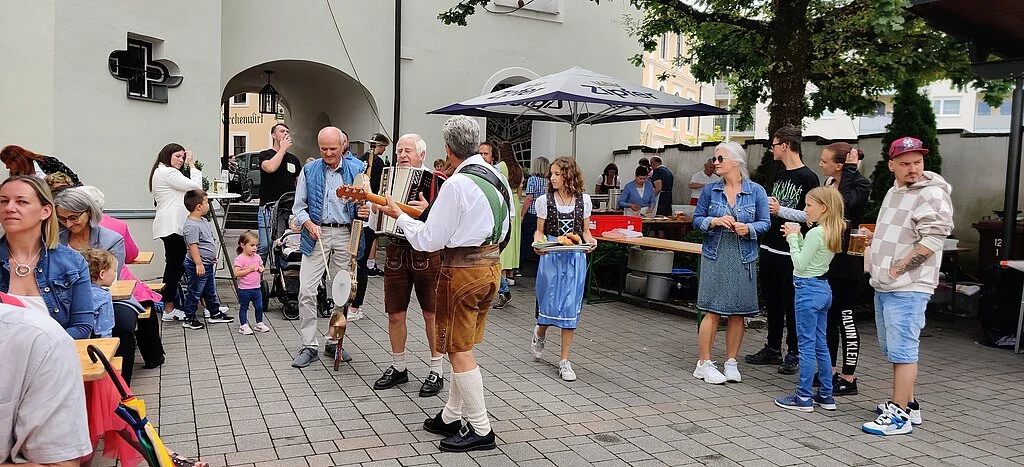 Das Organisationsteam um Monika Egger, Charly Schallhart, Julia Mitterer, Franz Schnellrieder und Heinz Werlberger (PGR-Obmann) hat ganze Arbeit geleistet. Mit einem großen Team ehrenamtlicher Helfer*innen konnte nach vier Jahren Abstinenz erstmals wieder das Pfarrfest stattfinden. Mit neuen Ideen (es wurde beispielsweise eine Hüpfburg für die Kinder organisiert), neuer Speisekarte (Steaksemmel, Grillfleisch, Kaspressknödl) und Altbewährtem (Weißwürste, Kuchen/Torten) konnten viele Besucher*innen angesprochen werden. Die von Pfarrer Christian organisierten Musikanten Lois und Gerhard vom Duo "Edelraute", ergänzt mit der Harfinistin Johanna Wörgetter und einem "Waschbrett-Percussionisten", sorgten für eine ausgezeichnete Stimmung. Von Tisch zu Tisch gehend gaben sie ihre fein und originell vorgetragenen Musikstücke zum Besten.