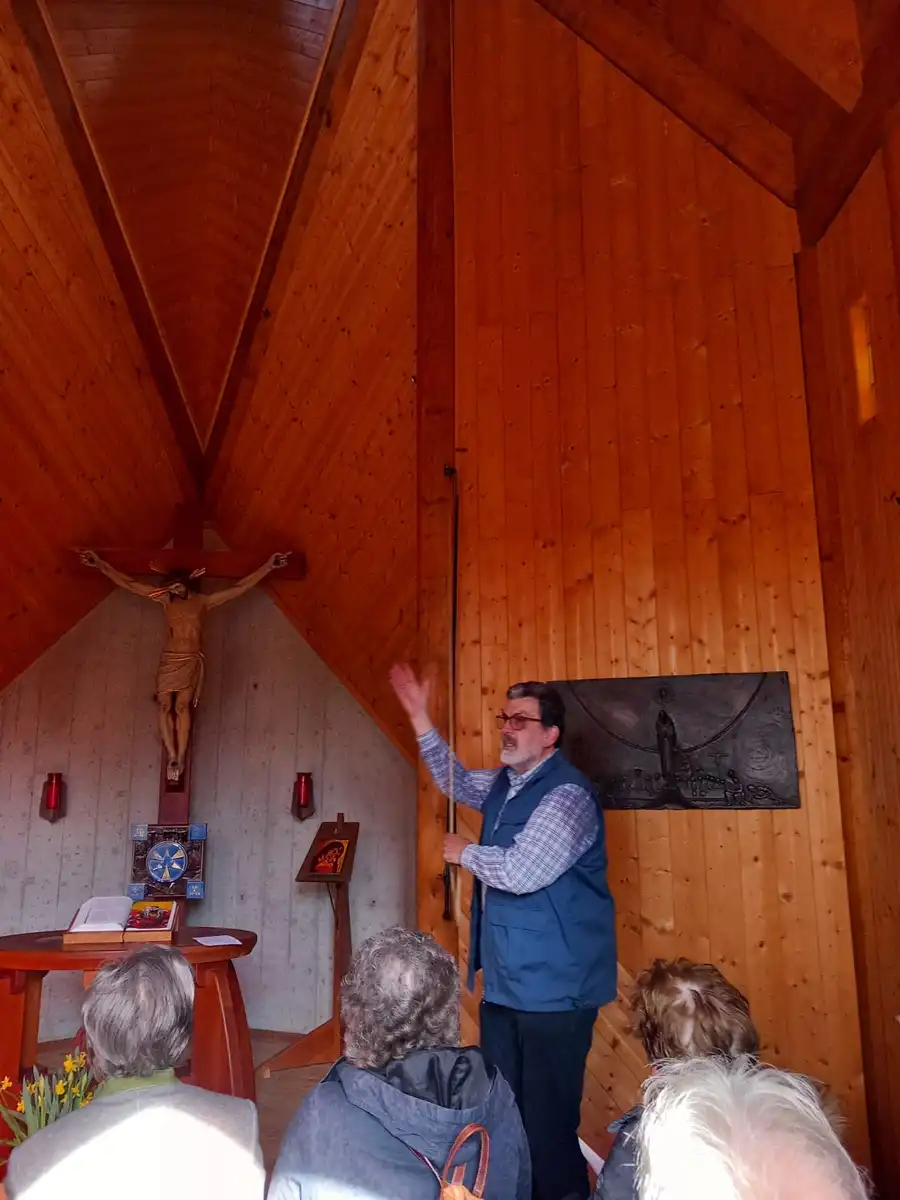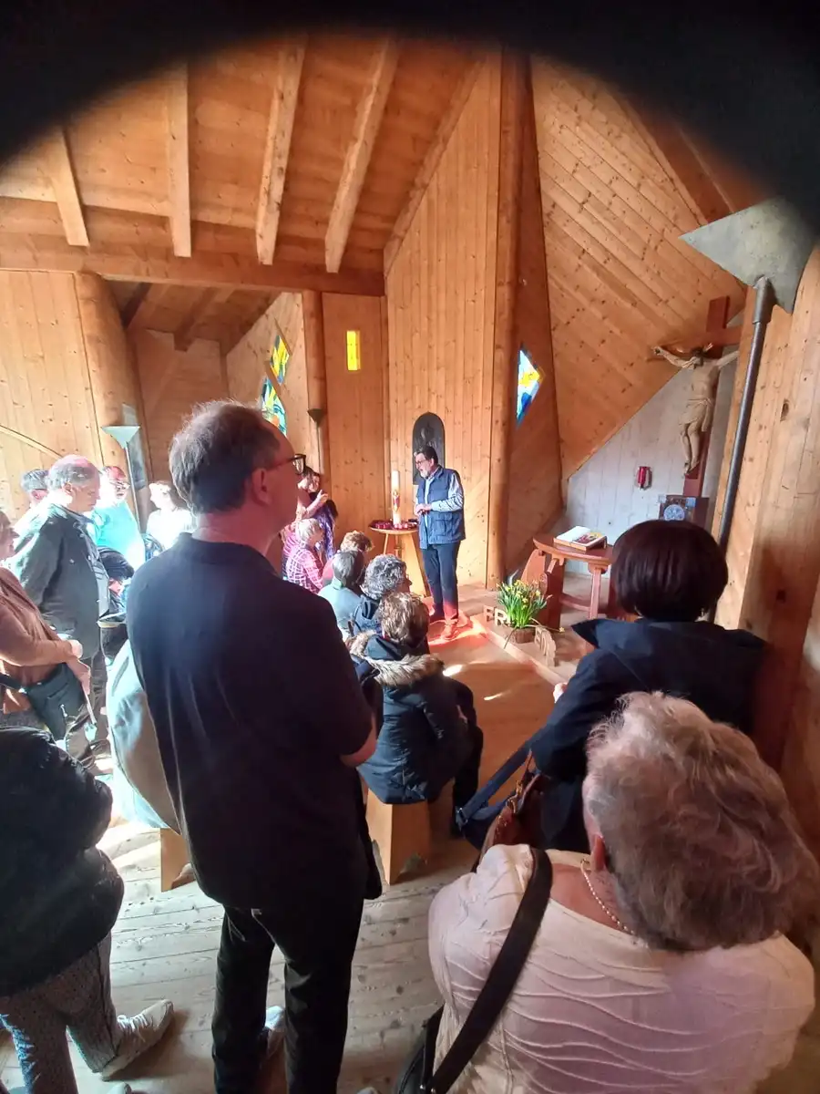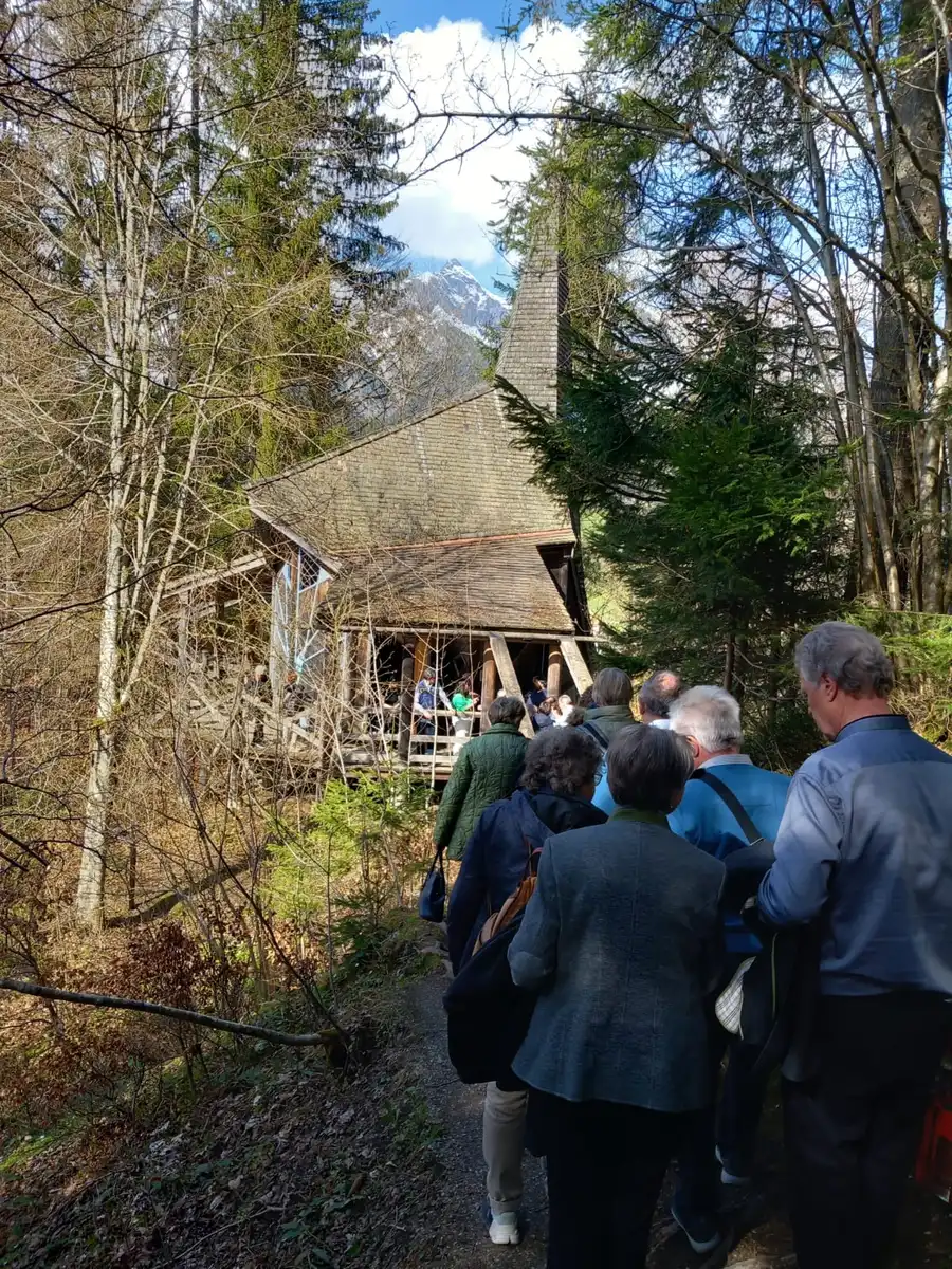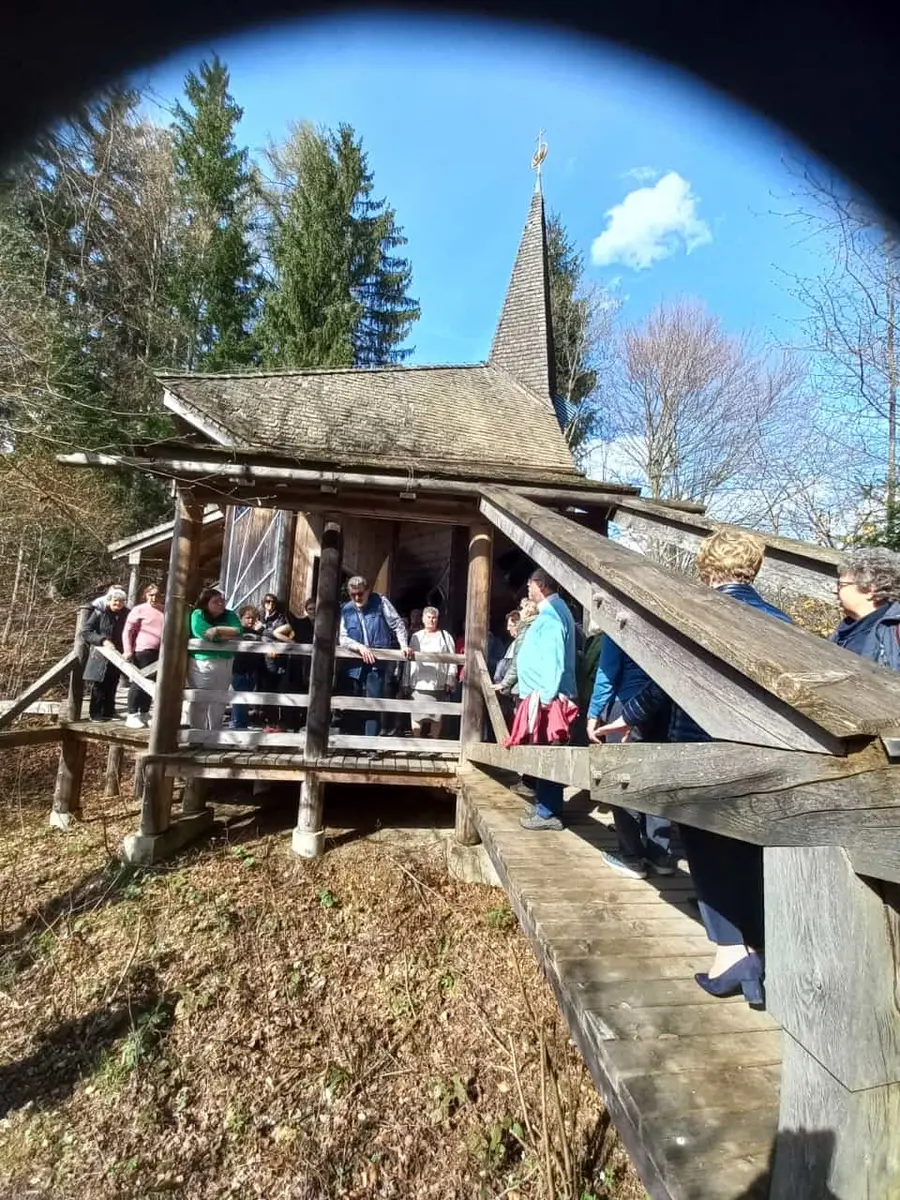 Zu Fuß ging es steil bergauf. Trotz mehrerer Zwischenstationen, an denen uns Walter Rinnerthaler Erklärungen zur Entstehungsgeschichte und den architektonischen Gegebenheiten der Kapelle gab, kamen einige gehörig ins Schwitzen, einige an ihre Grenzen. Vom Ehrgeiz gepackt unser Ziel zu erreichen, kamen wir alle heil in der Friedenskapelle an. Es lohnte sich. In diesem Kleinod, gelegen auf einem Hügel, eingebettet in die Ruhe des Waldes, sprachen wir noch ein gemeinsames Gebet. Nach einer kleinen Stärkung und einem sicheren Abstieg ging es zurück zum Bus. Müde und erschöpft, aber im Herzen bereichert, konnte man noch den schönen Erlebnissen und Begegnungen nachsinnieren, plaudern oder auch ein kleines Nickerchen machen. Der Tag neigte sich zu einem schönen Ende.