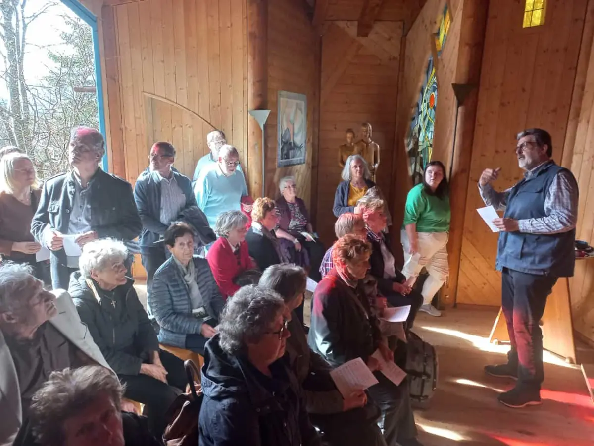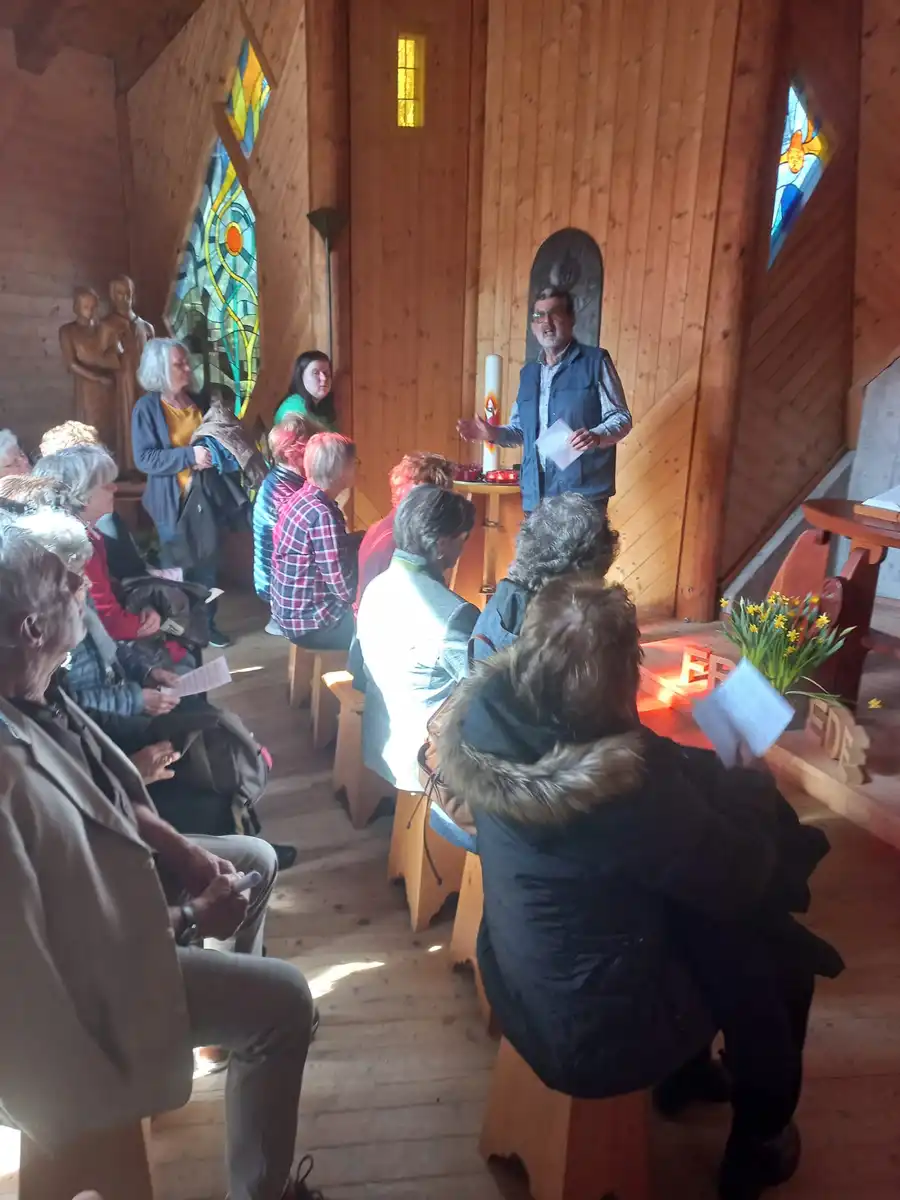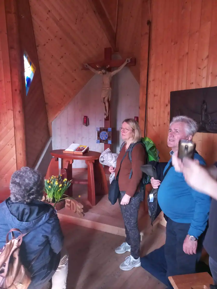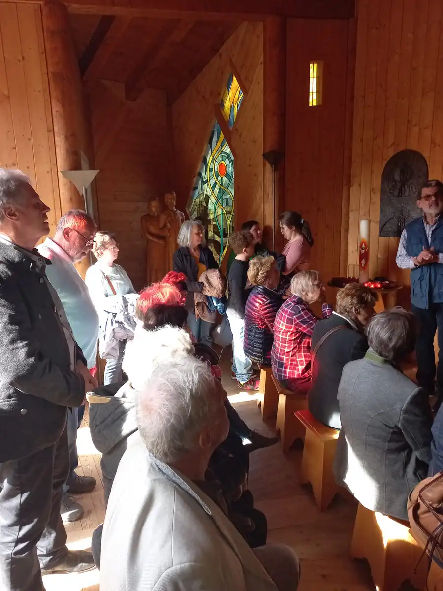 Zu Fuß ging es steil bergauf. Trotz mehrerer Zwischenstationen, an denen uns Walter Rinnerthaler Erklärungen zur Entstehungsgeschichte und den architektonischen Gegebenheiten der Kapelle gab, kamen einige gehörig ins Schwitzen, einige an ihre Grenzen. Vom Ehrgeiz gepackt unser Ziel zu erreichen, kamen wir alle heil in der Friedenskapelle an. Es lohnte sich. In diesem Kleinod, gelegen auf einem Hügel, eingebettet in die Ruhe des Waldes, sprachen wir noch ein gemeinsames Gebet. Nach einer kleinen Stärkung und einem sicheren Abstieg ging es zurück zum Bus. Müde und erschöpft, aber im Herzen bereichert, konnte man noch den schönen Erlebnissen und Begegnungen nachsinnieren, plaudern oder auch ein kleines Nickerchen machen. Der Tag neigte sich zu einem schönen Ende.