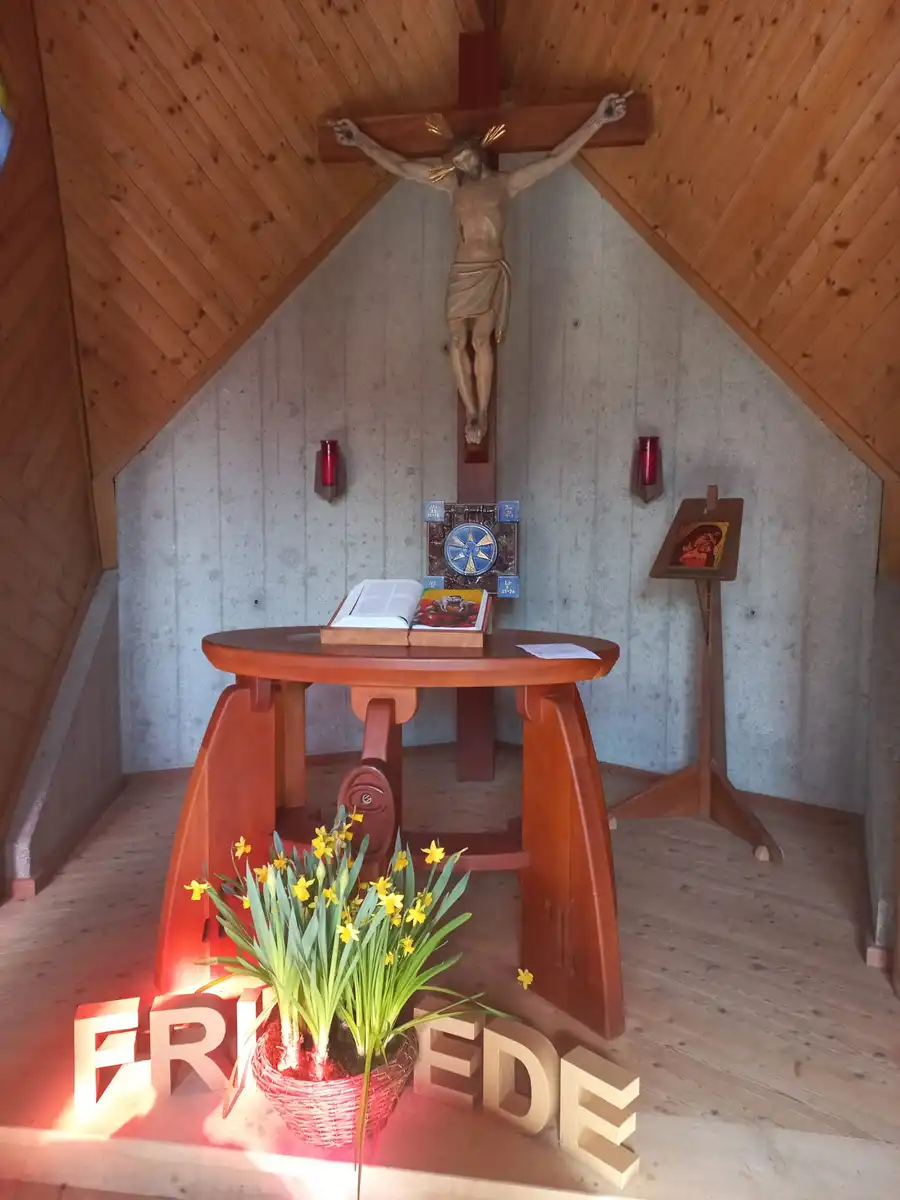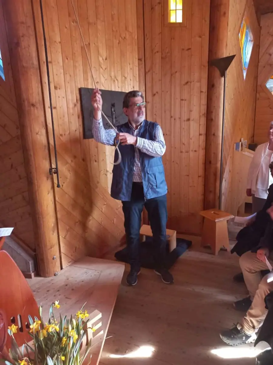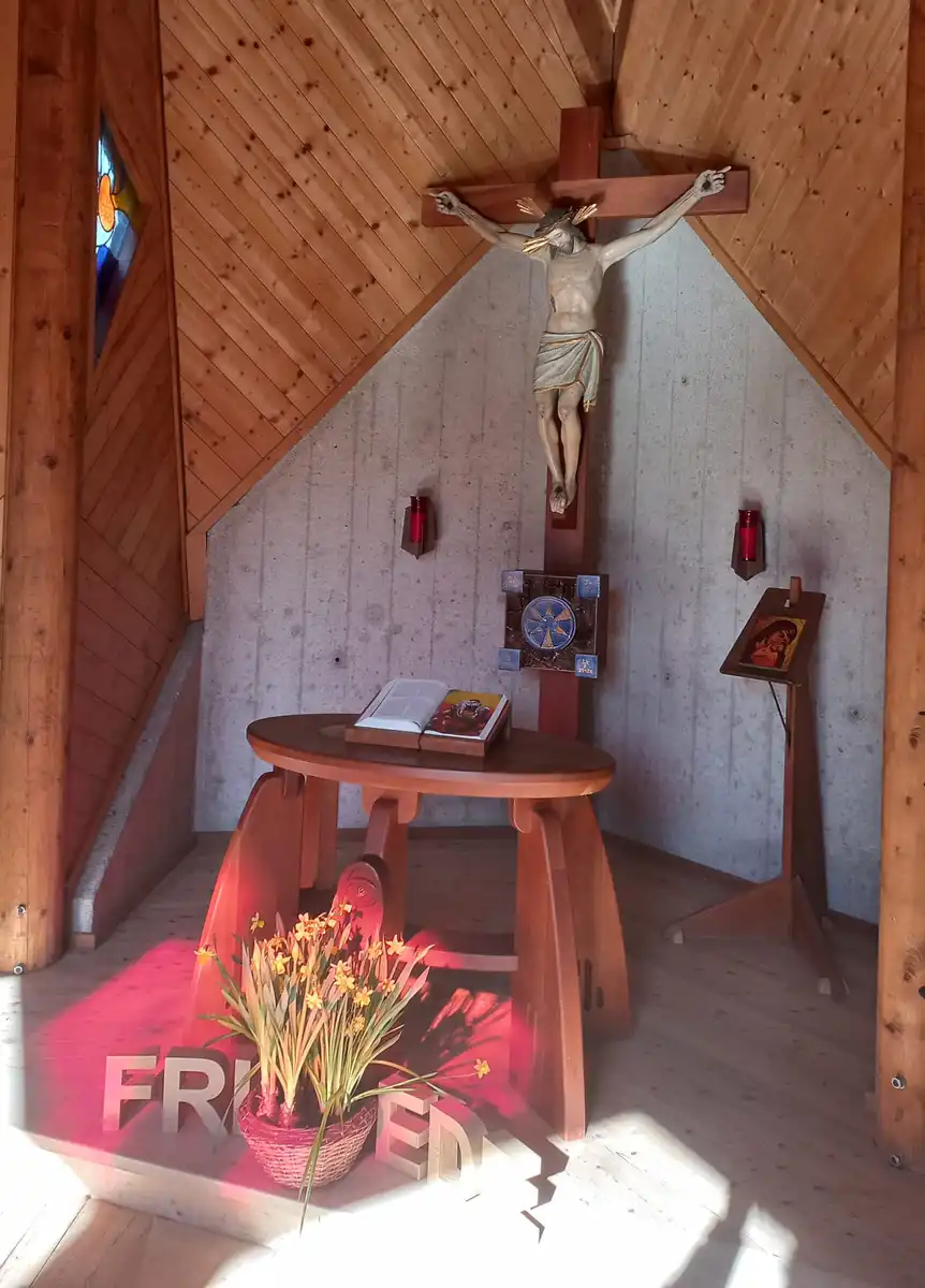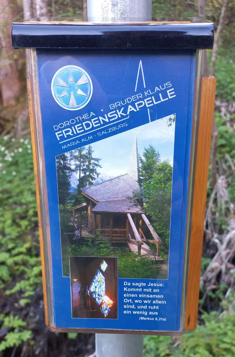 Nach dem Mittagessen trennten sich unsere Wege. Theo verabschiedete sich nach Bad Hofgastein. Wir hingegen machten uns auf dem Weg nach Maria Alm. Dort trafen wir mit dem pensionierten Religionslehrer Walter Rinnerthaler zusammen, der vor vielen Jahren die Errichtung der Friedenskapelle in Maria Alm initiierte. Diese im Geiste der Ökumene gestaltete Kapelle, die dem Heiligen Nikolaus von der Flüe und seiner Frau Dorothea gewidmet ist, weist auch einen Bezug zu Tirol auf: Die Bleiglasfenster wurden von der Glasfachschule Kramsach hergestellt.