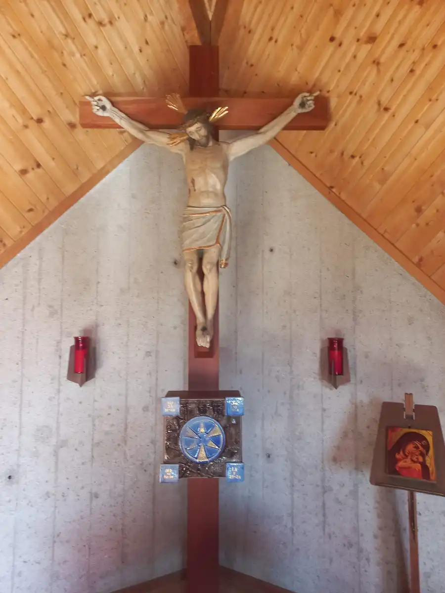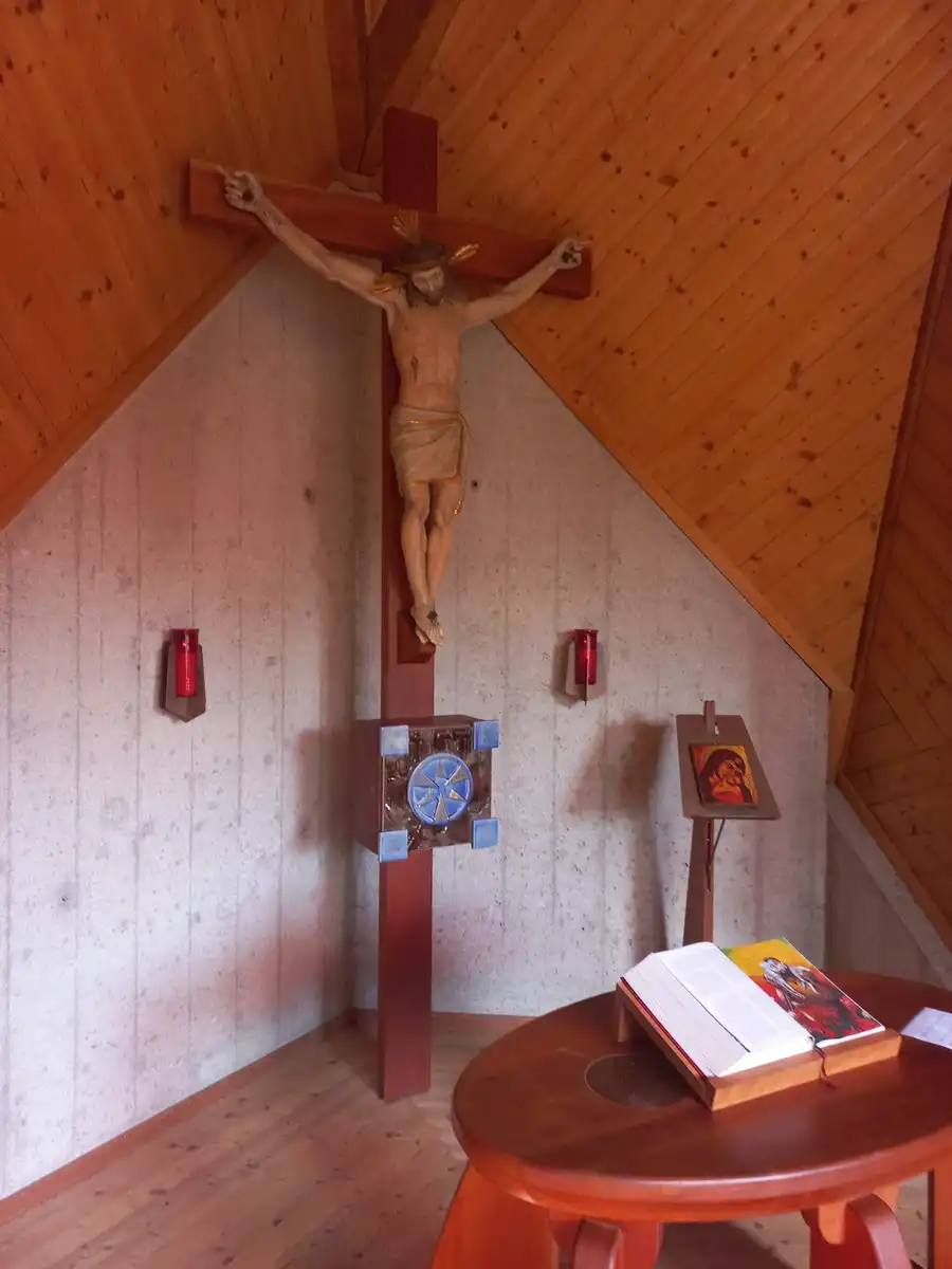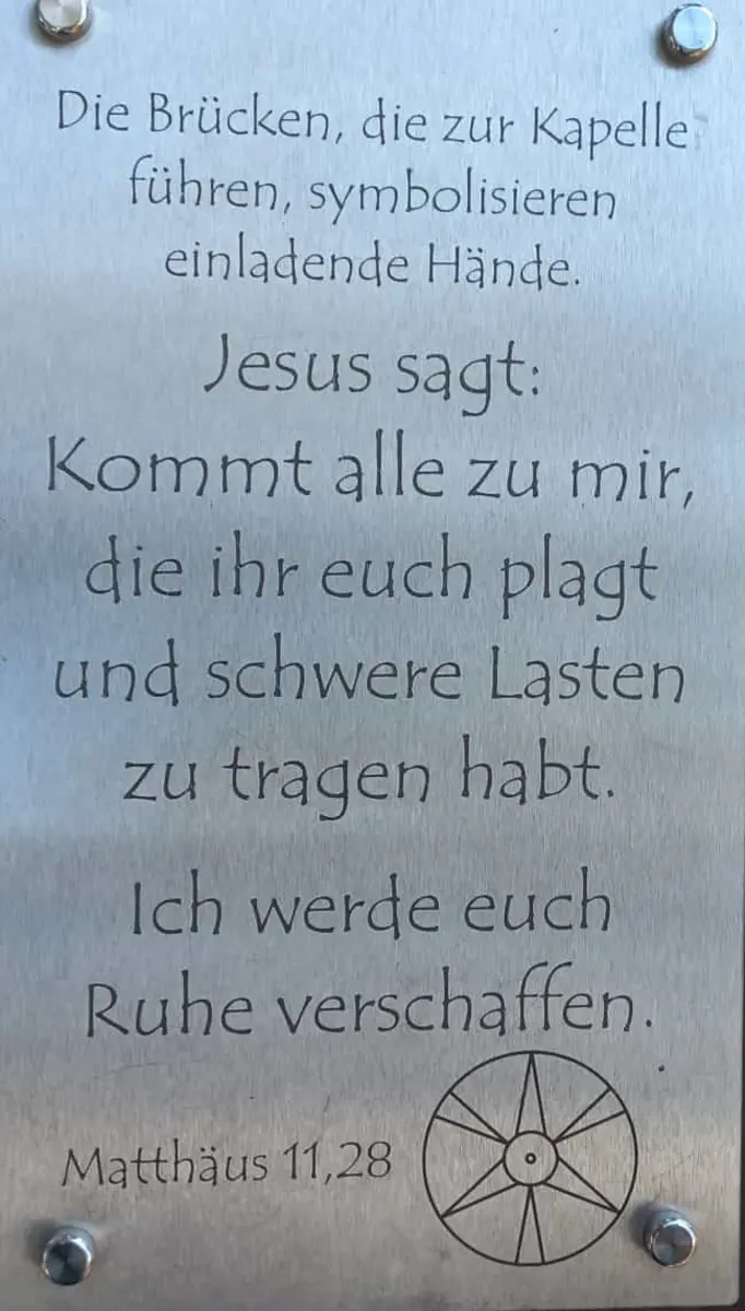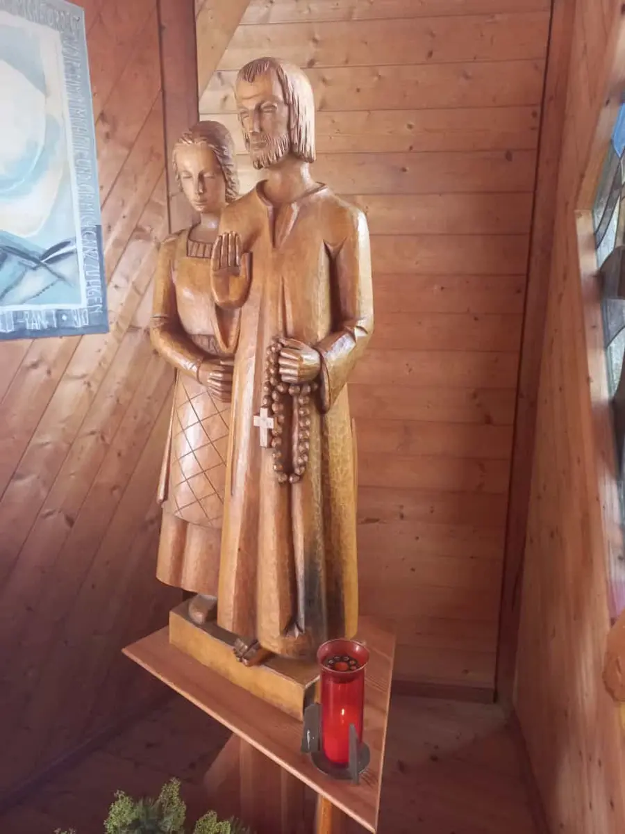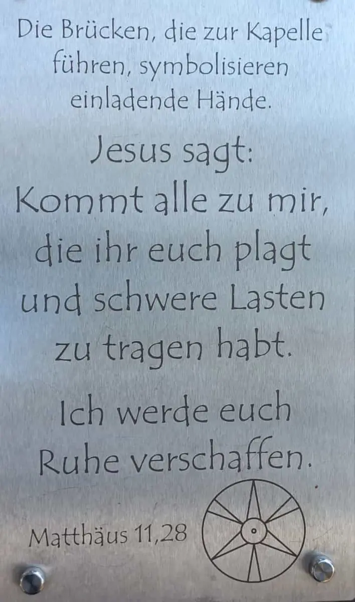 Nach dem Mittagessen trennten sich unsere Wege. Theo verabschiedete sich nach Bad Hofgastein. Wir hingegen machten uns auf dem Weg nach Maria Alm. Dort trafen wir mit dem pensionierten Religionslehrer Walter Rinnerthaler zusammen, der vor vielen Jahren die Errichtung der Friedenskapelle in Maria Alm initiierte. Diese im Geiste der Ökumene gestaltete Kapelle, die dem Heiligen Nikolaus von der Flüe und seiner Frau Dorothea gewidmet ist, weist auch einen Bezug zu Tirol auf: Die Bleiglasfenster wurden von der Glasfachschule Kramsach hergestellt.