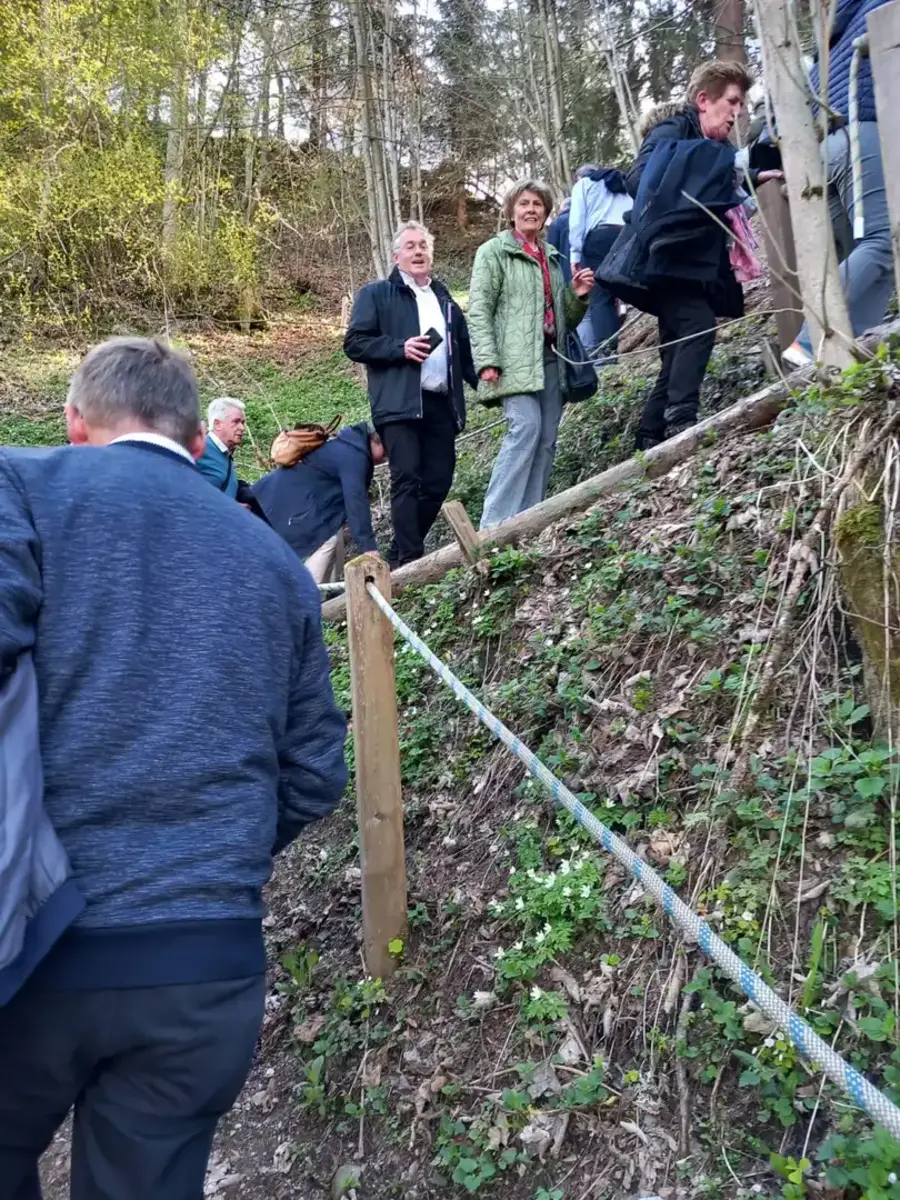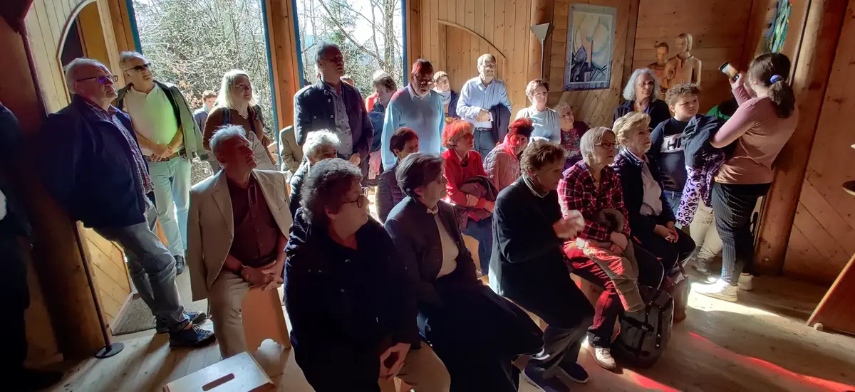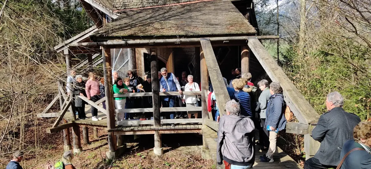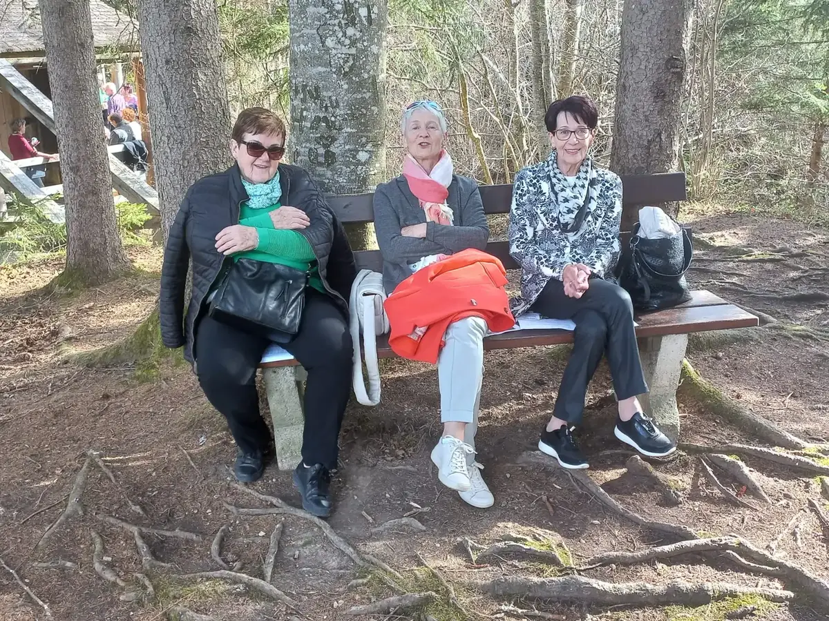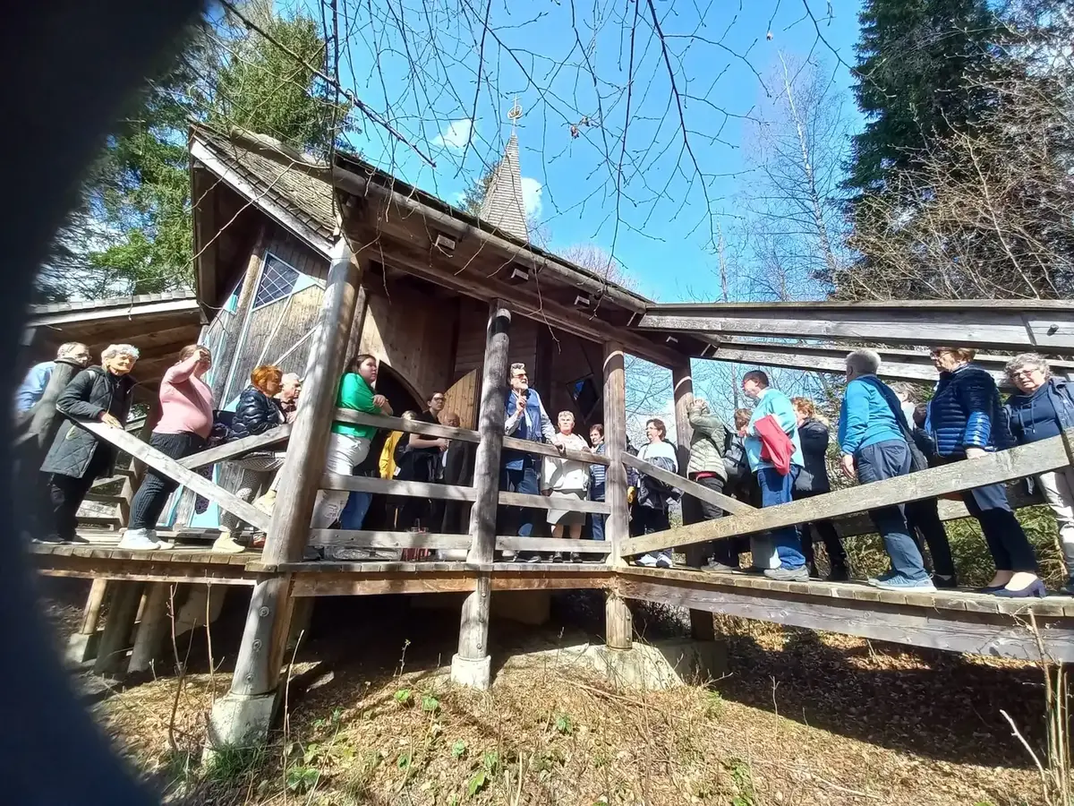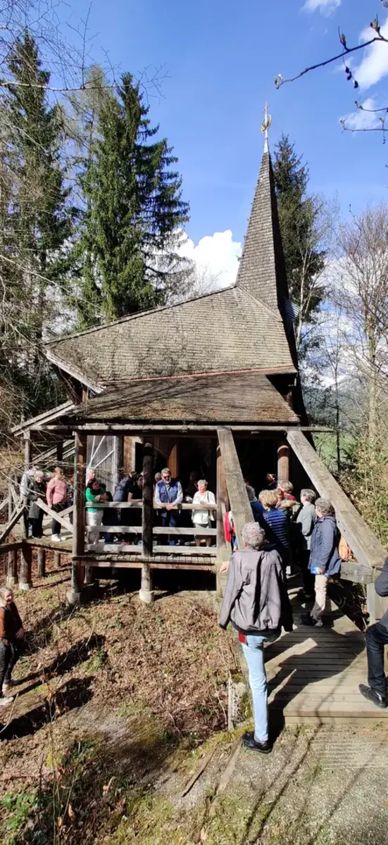 Zu Fuß ging es steil bergauf. Trotz mehrerer Zwischenstationen, an denen uns Walter Rinnerthaler Erklärungen zur Entstehungsgeschichte und den architektonischen Gegebenheiten der Kapelle gab, kamen einige gehörig ins Schwitzen, einige an ihre Grenzen. Vom Ehrgeiz gepackt unser Ziel zu erreichen, kamen wir alle heil in der Friedenskapelle an. Es lohnte sich. In diesem Kleinod, gelegen auf einem Hügel, eingebettet in die Ruhe des Waldes, sprachen wir noch ein gemeinsames Gebet. Nach einer kleinen Stärkung und einem sicheren Abstieg ging es zurück zum Bus. Müde und erschöpft, aber im Herzen bereichert, konnte man noch den schönen Erlebnissen und Begegnungen nachsinnieren, plaudern oder auch ein kleines Nickerchen machen. Der Tag neigte sich zu einem schönen Ende.