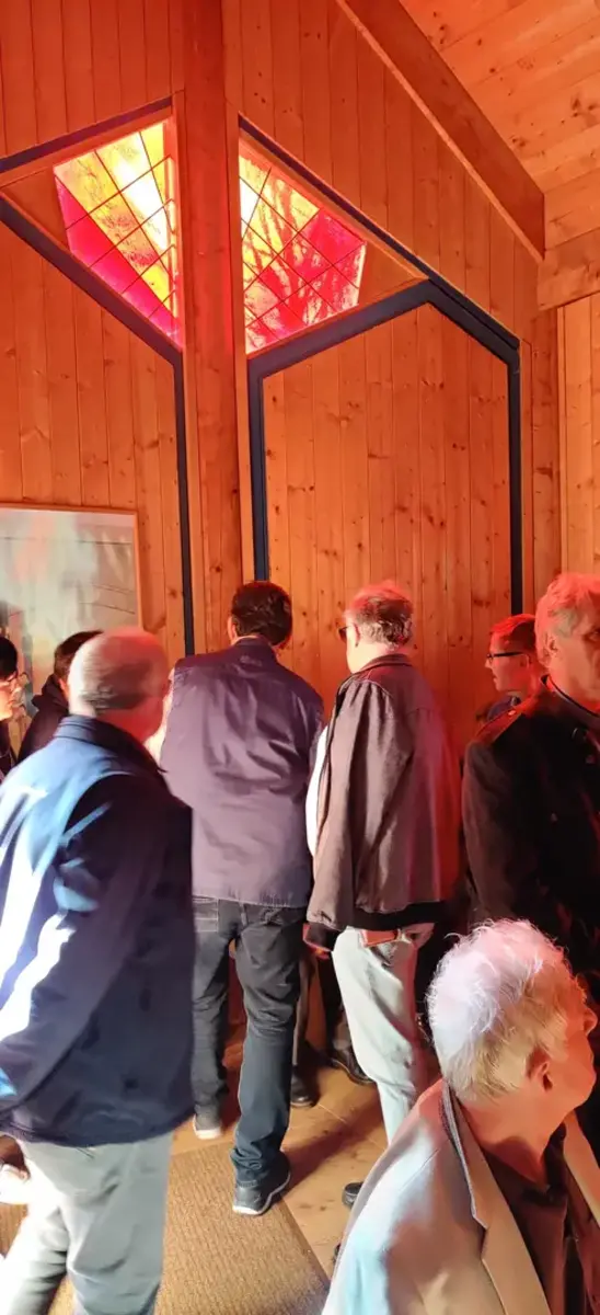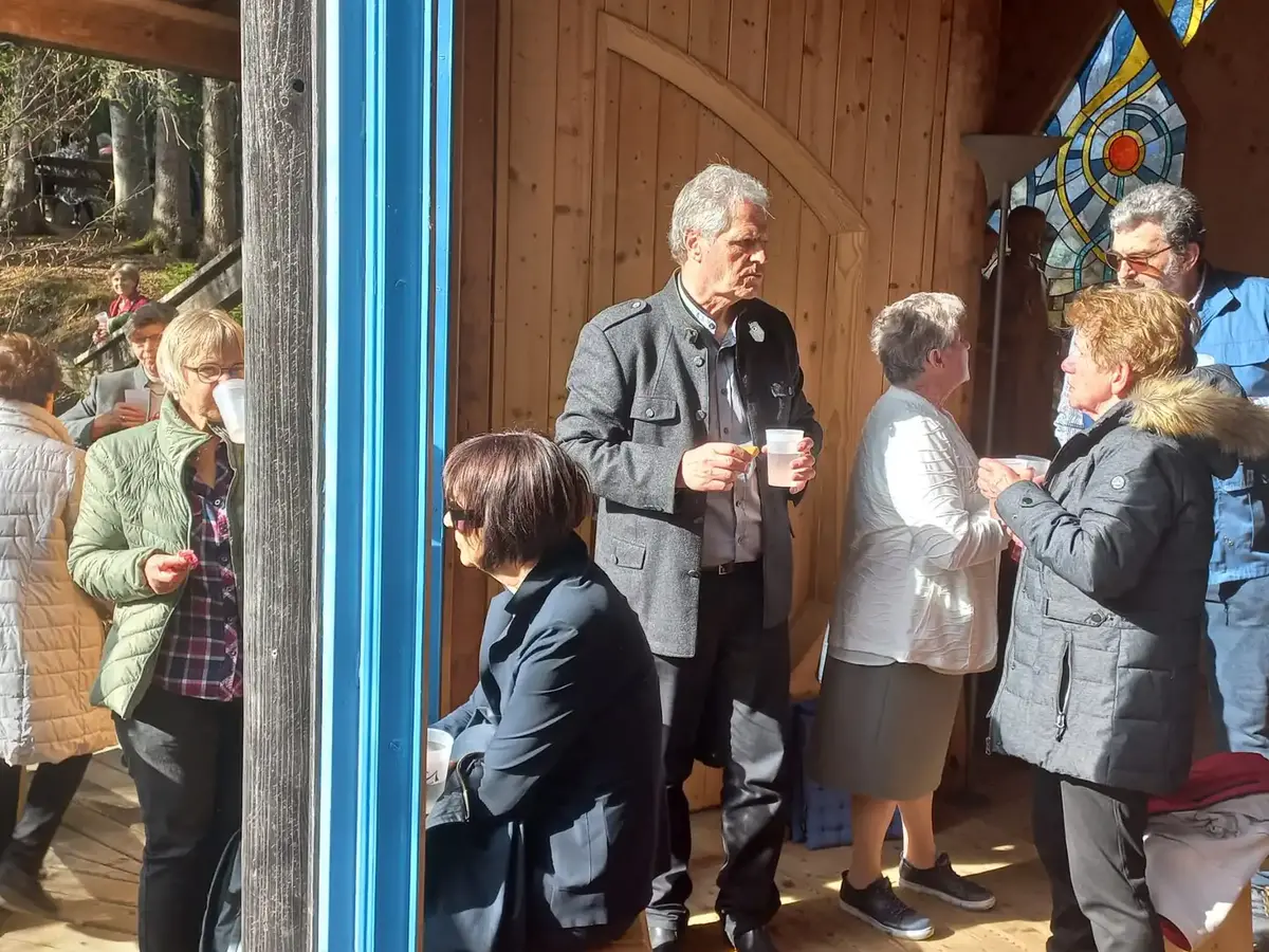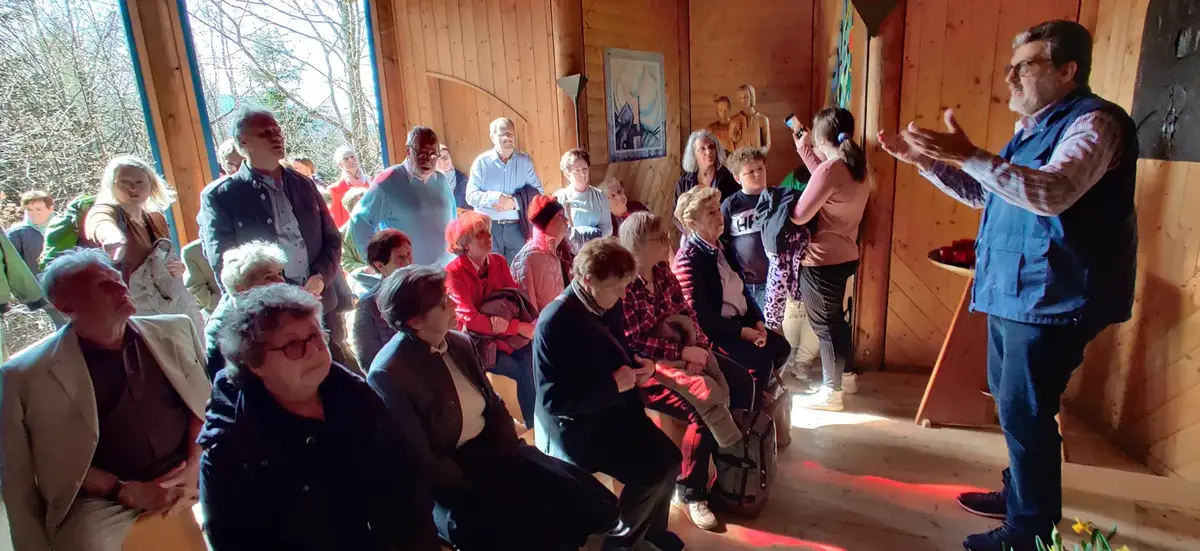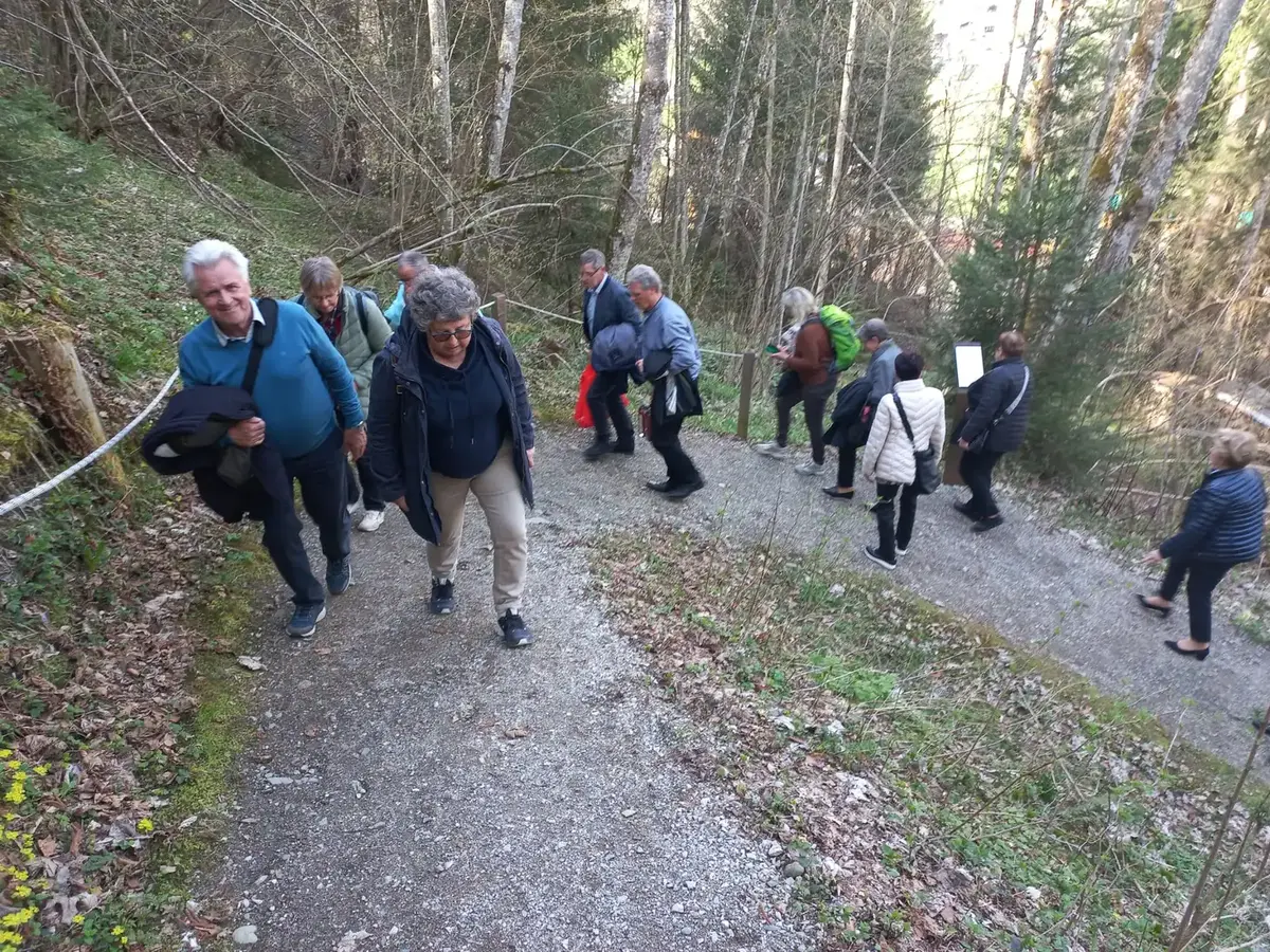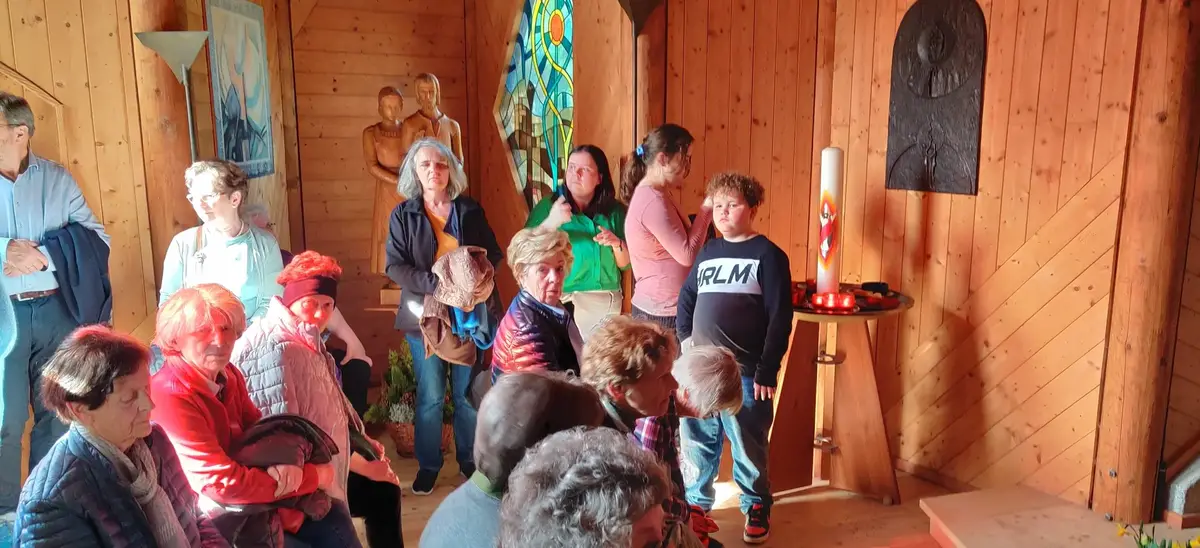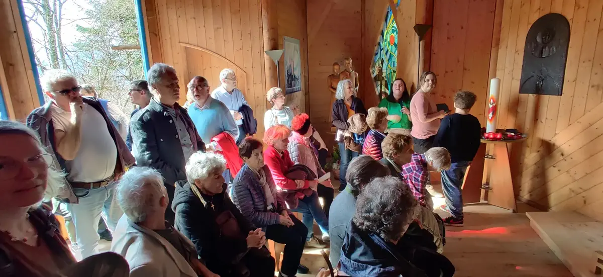 Zu Fuß ging es steil bergauf. Trotz mehrerer Zwischenstationen, an denen uns Walter Rinnerthaler Erklärungen zur Entstehungsgeschichte und den architektonischen Gegebenheiten der Kapelle gab, kamen einige gehörig ins Schwitzen, einige an ihre Grenzen. Vom Ehrgeiz gepackt unser Ziel zu erreichen, kamen wir alle heil in der Friedenskapelle an. Es lohnte sich. In diesem Kleinod, gelegen auf einem Hügel, eingebettet in die Ruhe des Waldes, sprachen wir noch ein gemeinsames Gebet. Nach einer kleinen Stärkung und einem sicheren Abstieg ging es zurück zum Bus. Müde und erschöpft, aber im Herzen bereichert, konnte man noch den schönen Erlebnissen und Begegnungen nachsinnieren, plaudern oder auch ein kleines Nickerchen machen. Der Tag neigte sich zu einem schönen Ende.