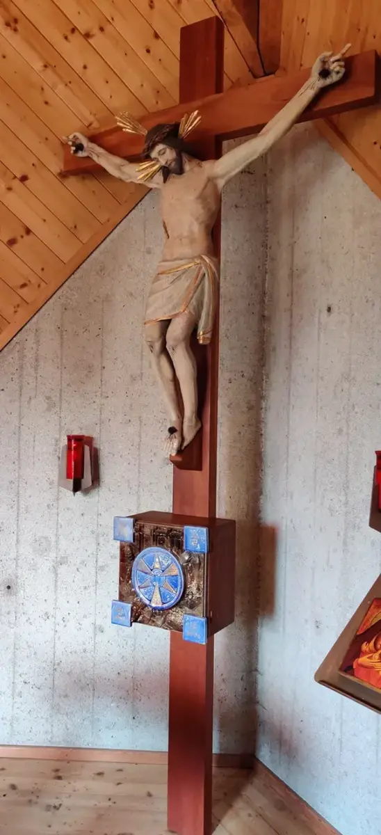 Nach dem Mittagessen trennten sich unsere Wege. Theo verabschiedete sich nach Bad Hofgastein. Wir hingegen machten uns auf dem Weg nach Maria Alm. Dort trafen wir mit dem pensionierten Religionslehrer Walter Rinnerthaler zusammen, der vor vielen Jahren die Errichtung der Friedenskapelle in Maria Alm initiierte. Diese im Geiste der Ökumene gestaltete Kapelle, die dem Heiligen Nikolaus von der Flüe und seiner Frau Dorothea gewidmet ist, weist auch einen Bezug zu Tirol auf: Die Bleiglasfenster wurden von der Glasfachschule Kramsach hergestellt.