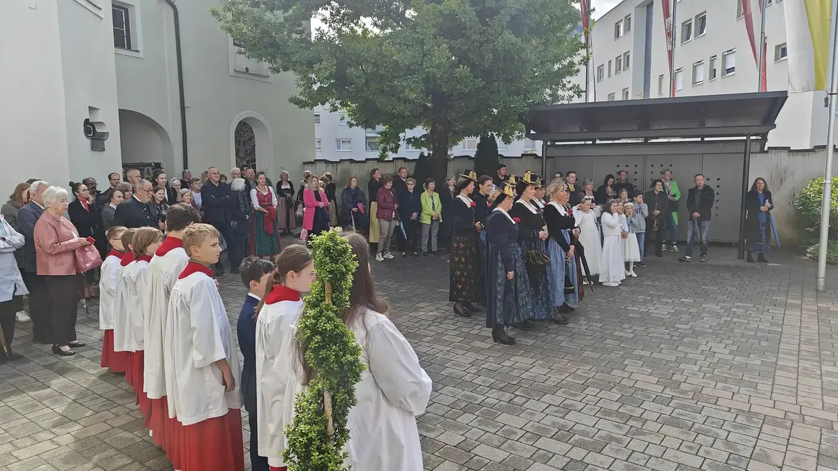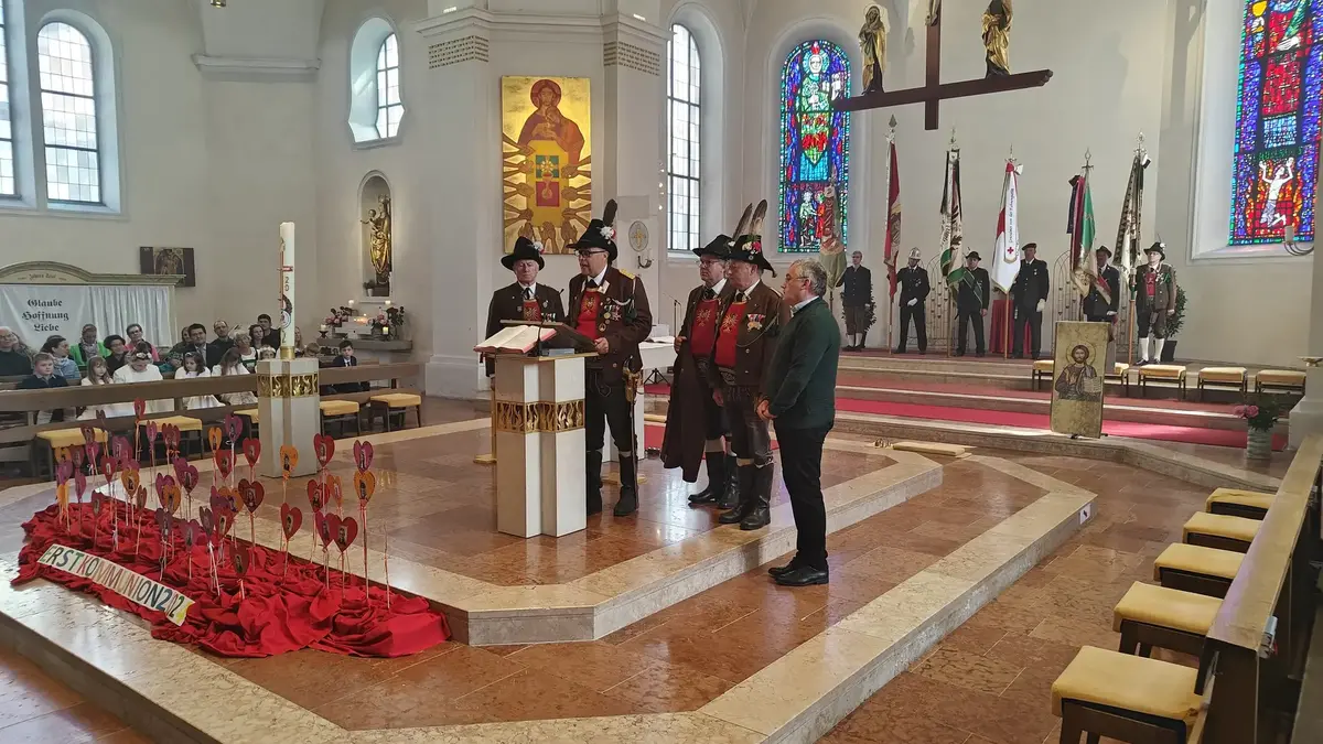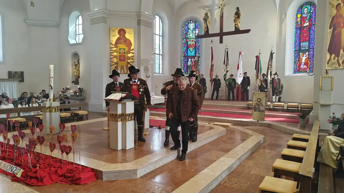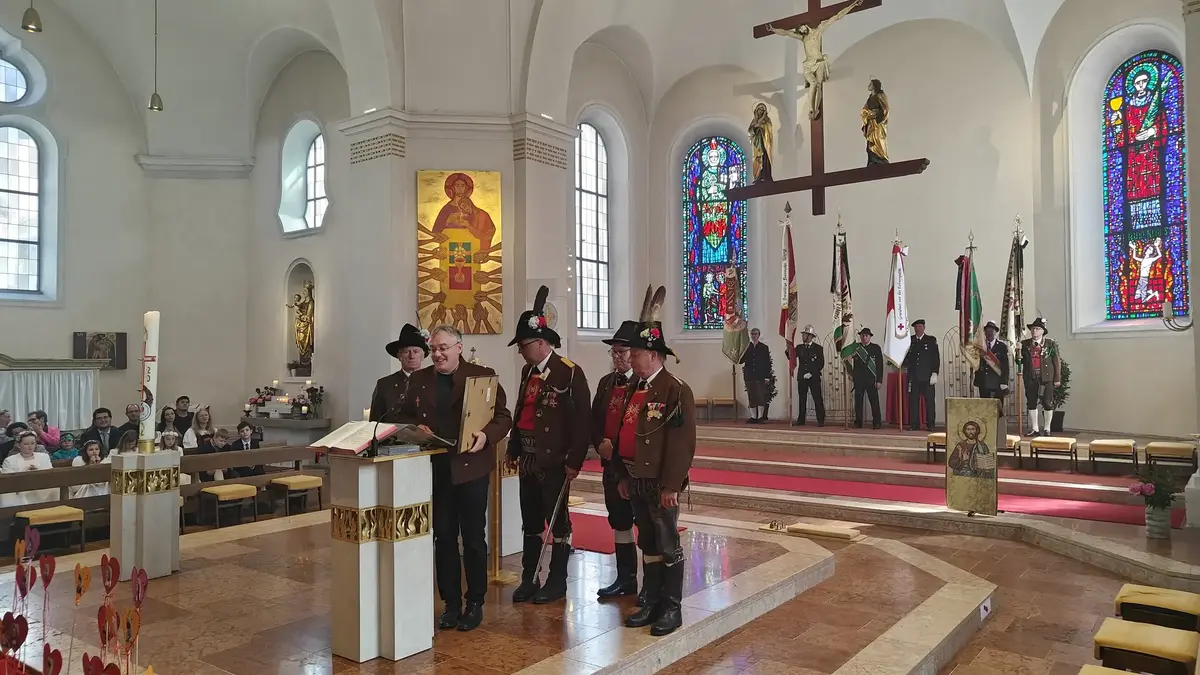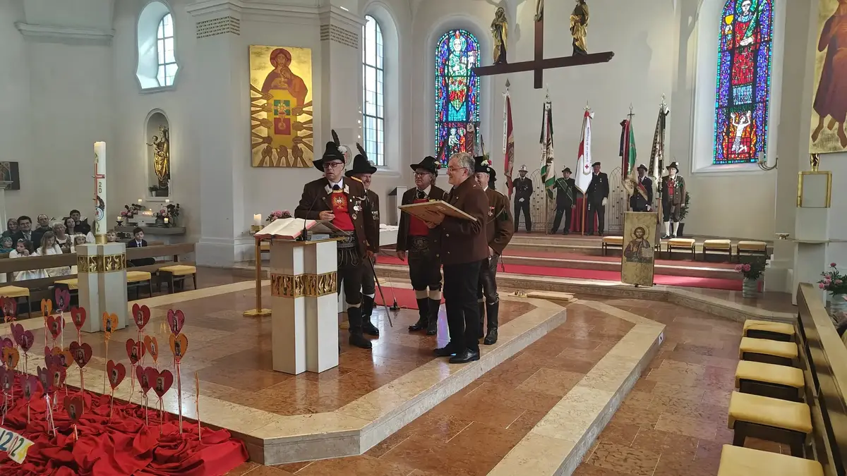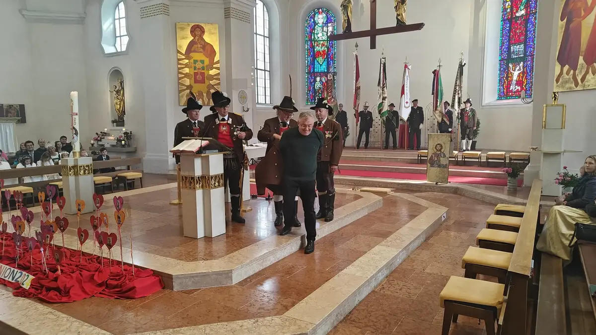 Auch wenn die Fronleichnamsprozession wegen des intensiven Regens vor Beginn des Gottesdienstes abgesagt werden musste, konnte das diesjährige Fronleichnamsfest mit einem überraschenden Höhepunkt aufwarten. Major Manfred Schachner, Bataillonskommandant des Schützenbataillons Kufstein und Obmann der Sepp Innerkofler Standschützenkompanie Wörgl, bat die versammelte Feiergemeinde, unter ihnen auch Bürgermeister Michael Riedhart, Stadt- und Gemeinderäte, Pfarrgemeinderäte und Pfarrgemeinderatsobmann Heinz Werlberger, die Fahnenabordnungen und Vertreter*innen der Traditionsvereine und Kassettl-Frauen, am Ende des Gottesdienstes noch auszuharren. Den Grund dafür ließ er offen.