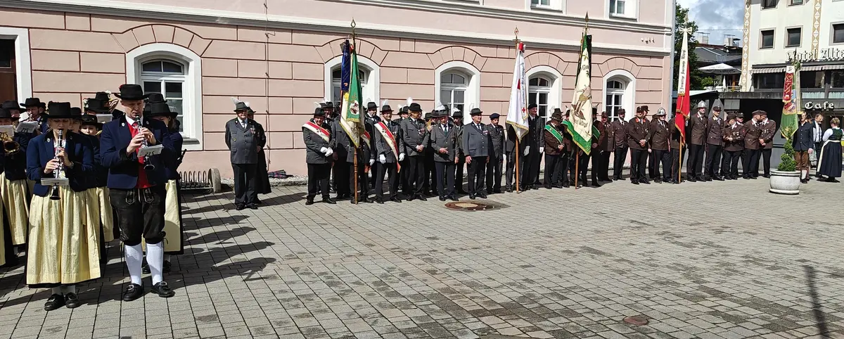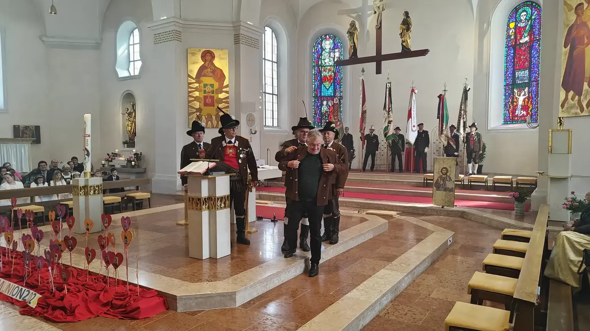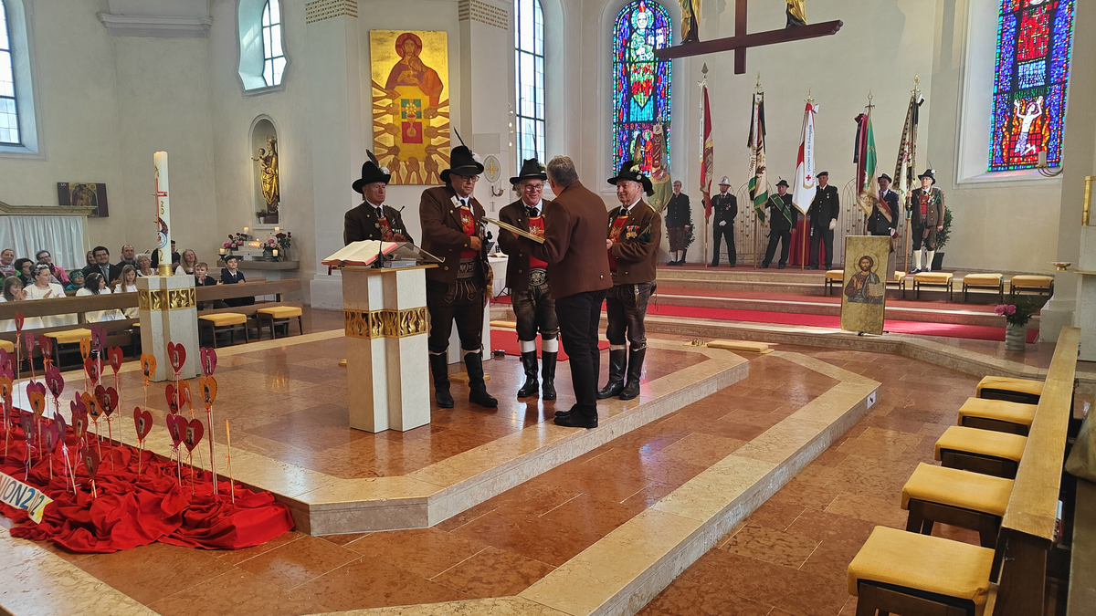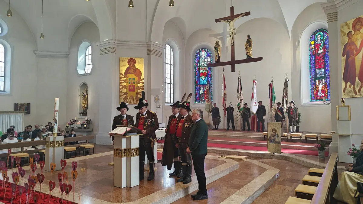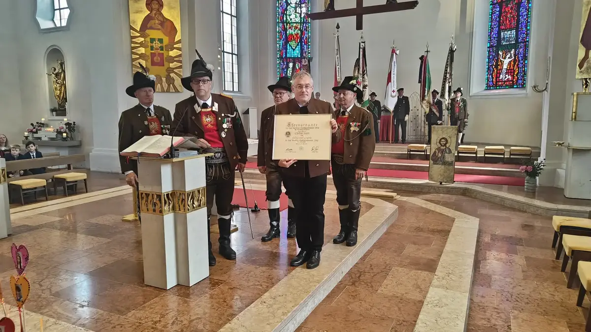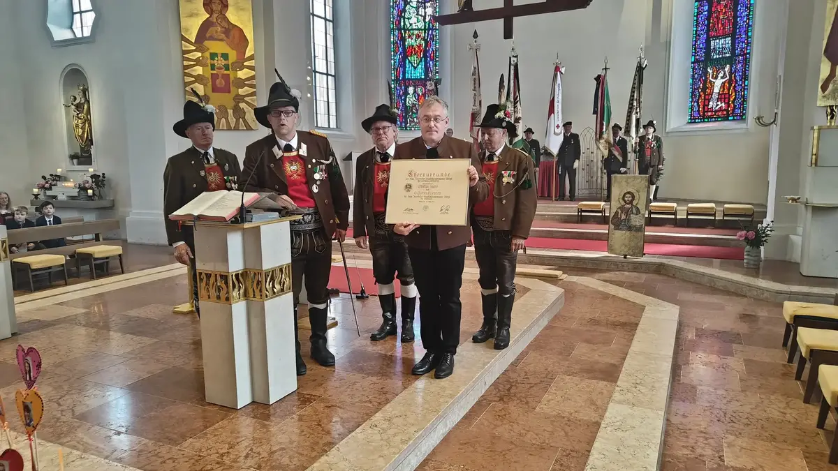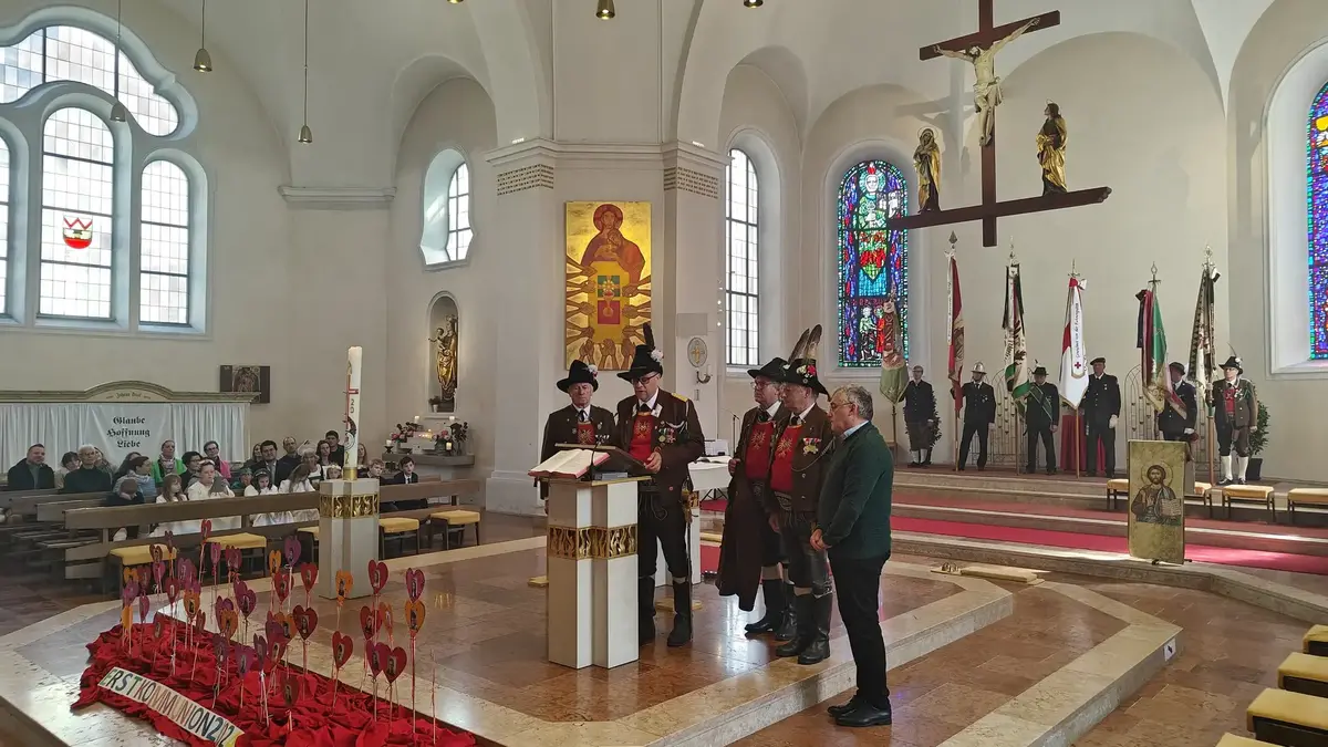 Auch wenn die Fronleichnamsprozession wegen des intensiven Regens vor Beginn des Gottesdienstes abgesagt werden musste, konnte das diesjährige Fronleichnamsfest mit einem überraschenden Höhepunkt aufwarten. Major Manfred Schachner, Bataillonskommandant des Schützenbataillons Kufstein und Obmann der Sepp Innerkofler Standschützenkompanie Wörgl, bat die versammelte Feiergemeinde, unter ihnen auch Bürgermeister Michael Riedhart, Stadt- und Gemeinderäte, Pfarrgemeinderäte und Pfarrgemeinderatsobmann Heinz Werlberger, die Fahnenabordnungen und Vertreter*innen der Traditionsvereine und Kassettl-Frauen, am Ende des Gottesdienstes noch auszuharren. Den Grund dafür ließ er offen.