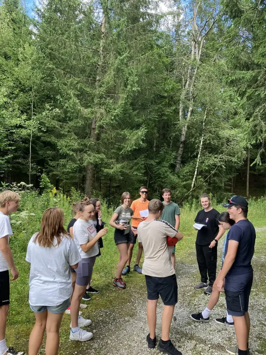 Der Samstag bot Gelegenheit für spannende Herausforderungen in Kleingruppen, die Geschicklichkeit und Wissen erforderten. Diese Challenges wurden am Nachmittag von den anderen Gruppen begeistert angenommen. Am Abend durften sich alle, die Lust hatten, auf die "Nightline" einlassen. Die „Nightline“ ist eine erlebnispädagogische Methode, bei der ein Seil durch den dunklen Wald gespannt wird, an dem entlang alle Teilnehmer*innen mit einer Augenbinde sicher durch die Dunkelheit und das Ungewisse geführt werden. Im Anschluss wurde der Abend mit einem spirituellen Input gemütlich am Lagerfeuer beendet.